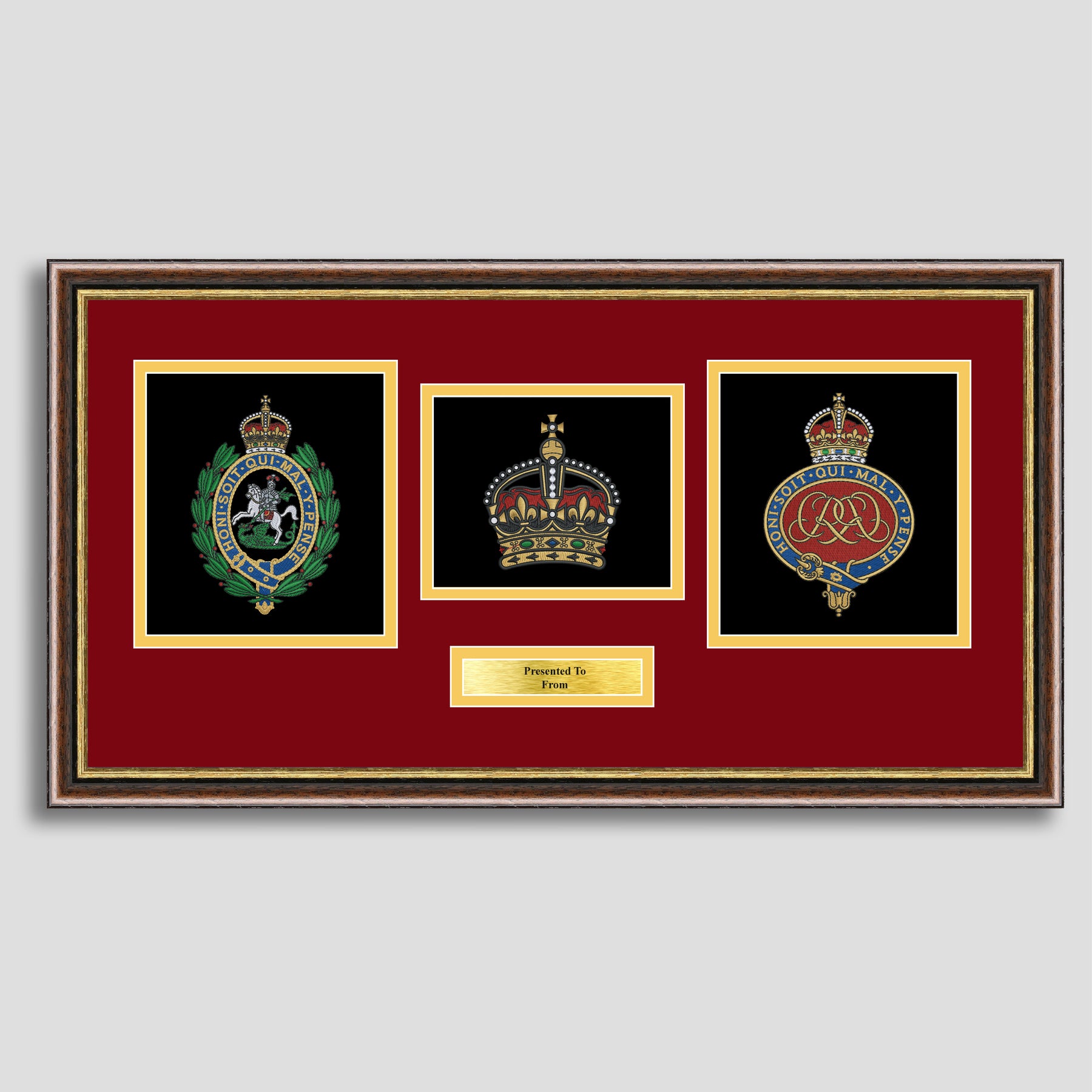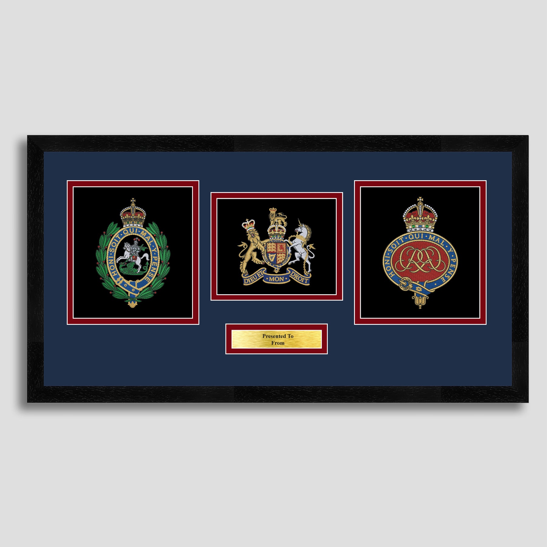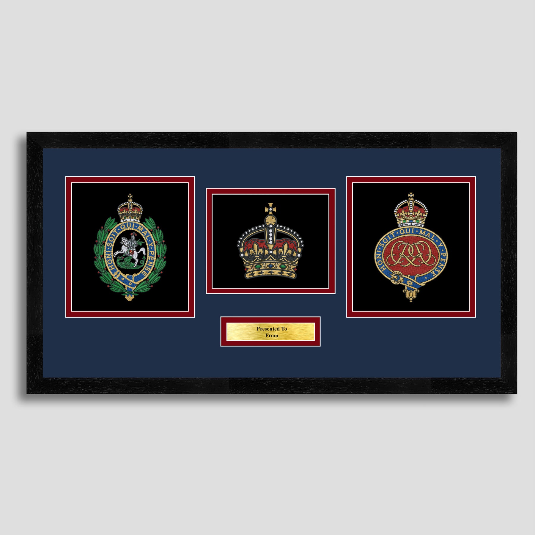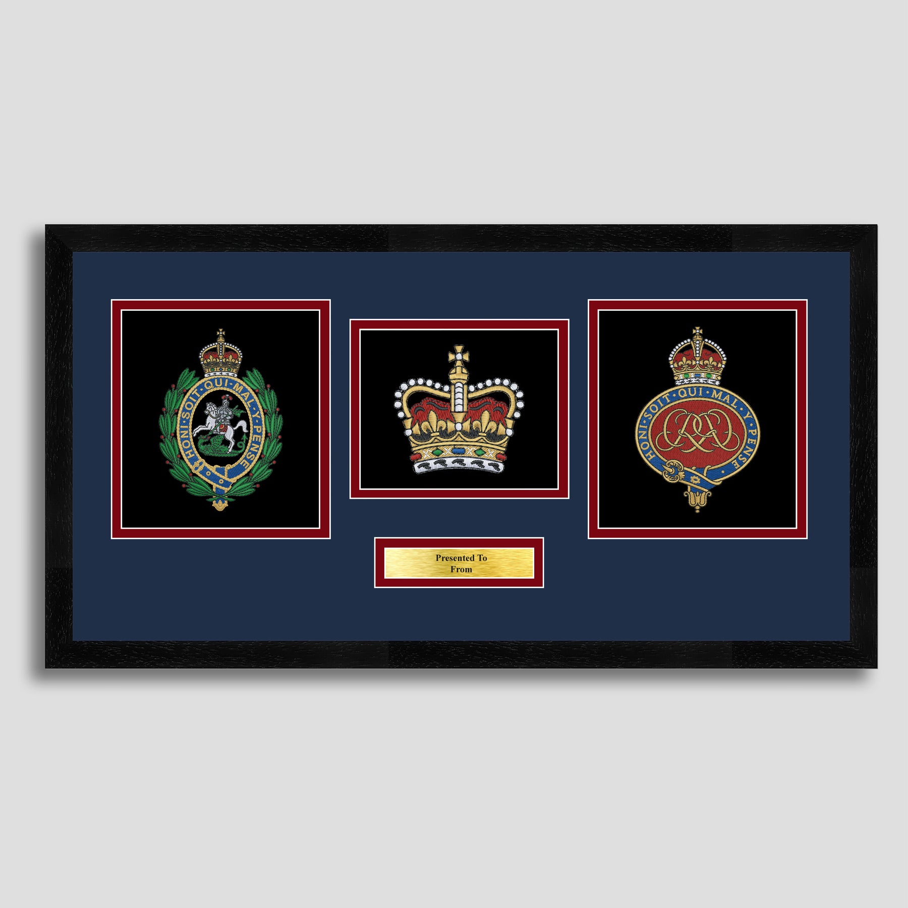 To finish, all our embroidery frames are double mounted to match regiment colours and includes a brass plaque with your own personal message.