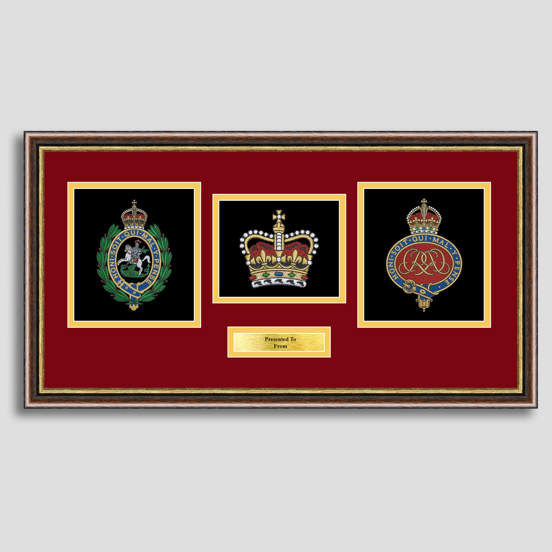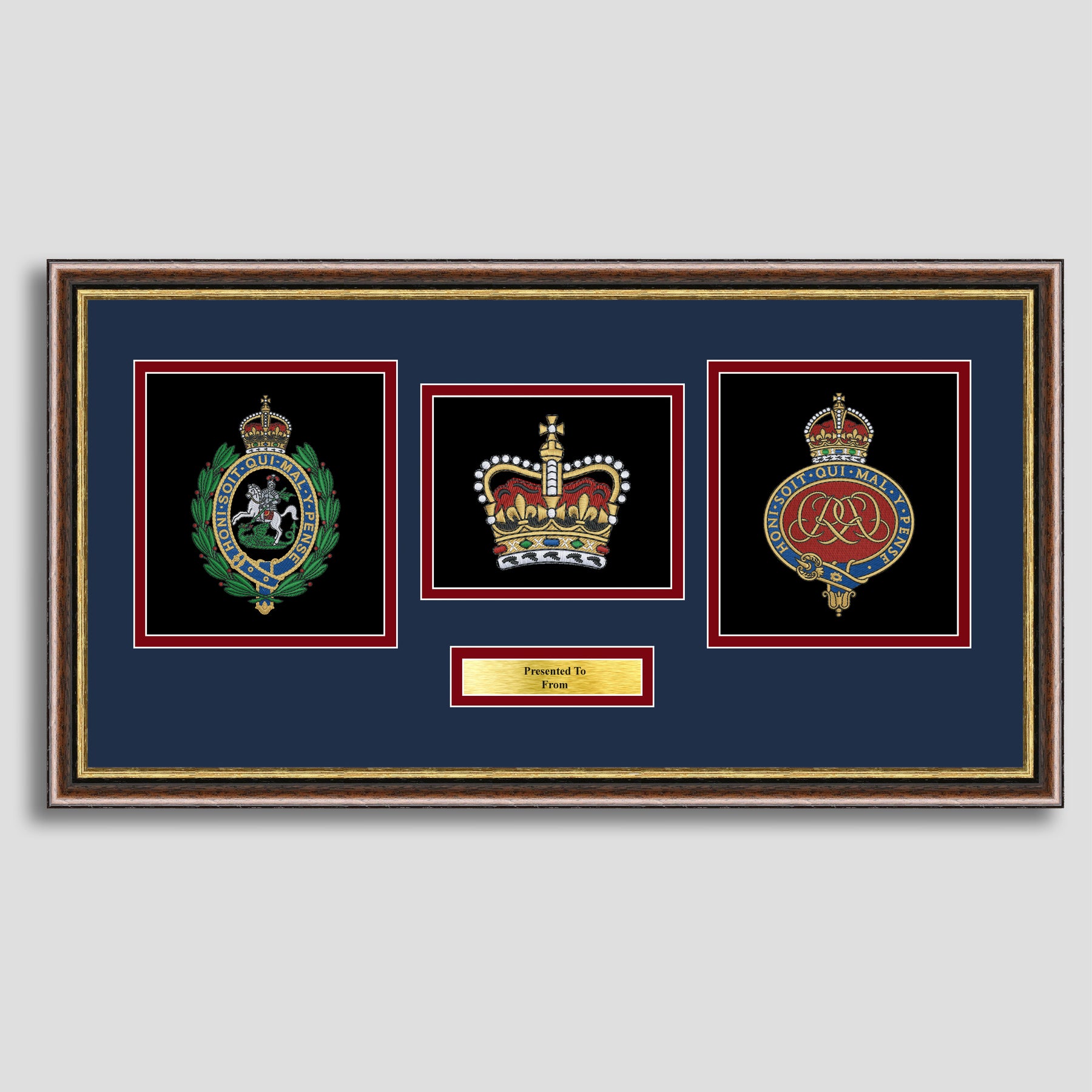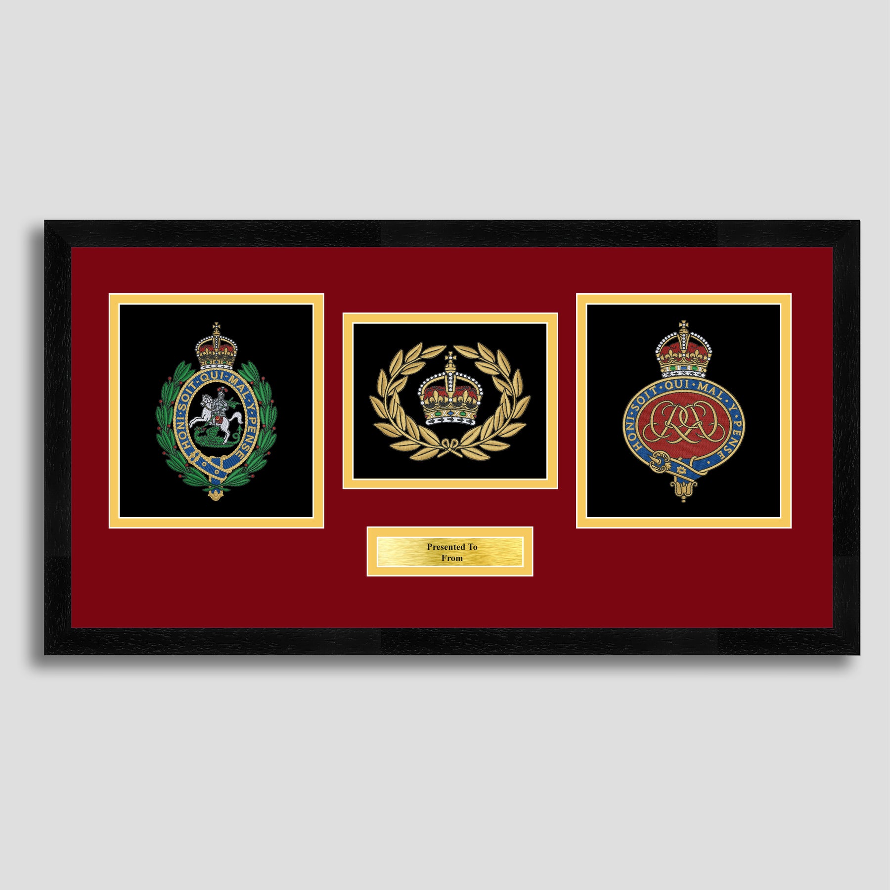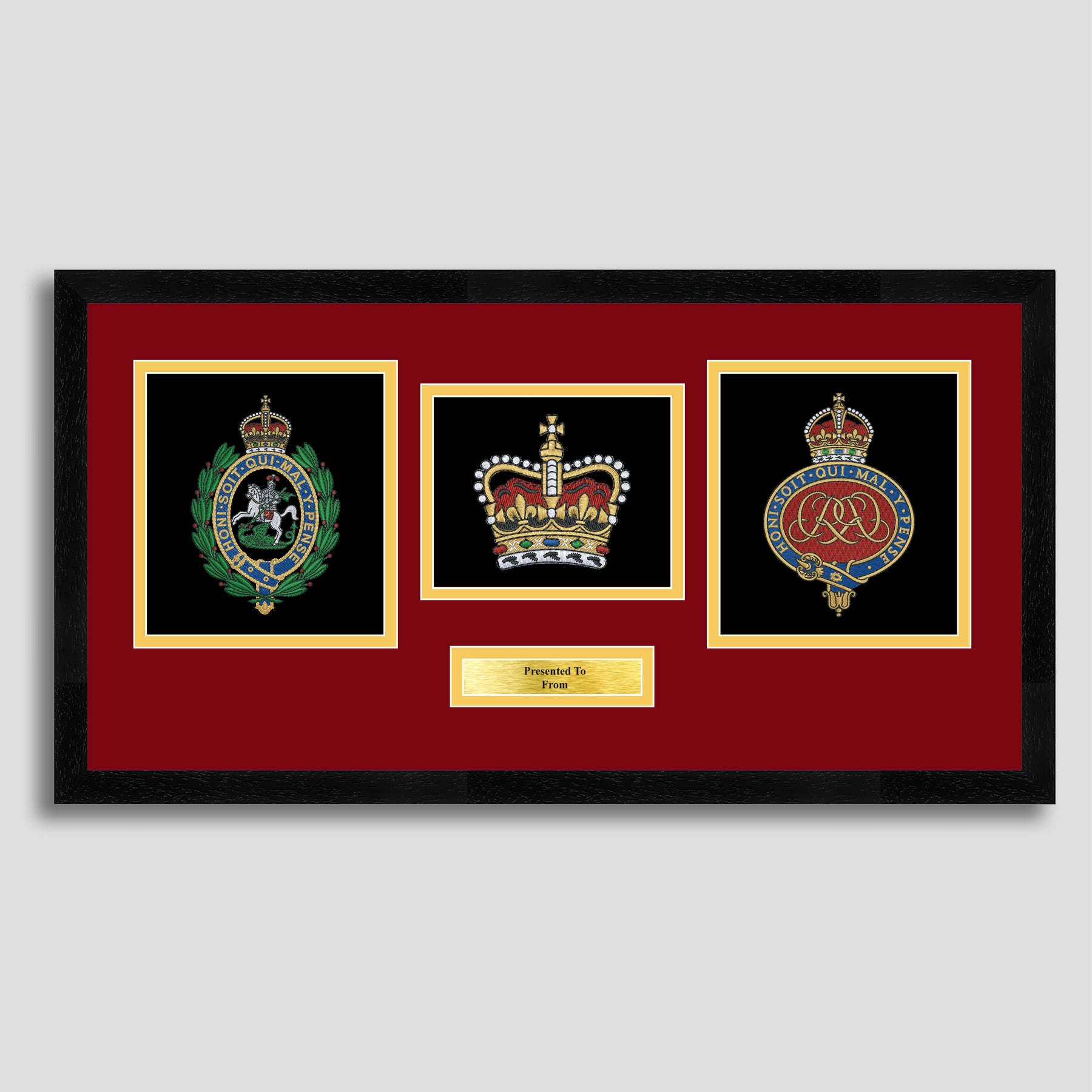 To finish, all our embroidery frames are double mounted to match regiment colours and includes a brass plaque with your own personal message.
