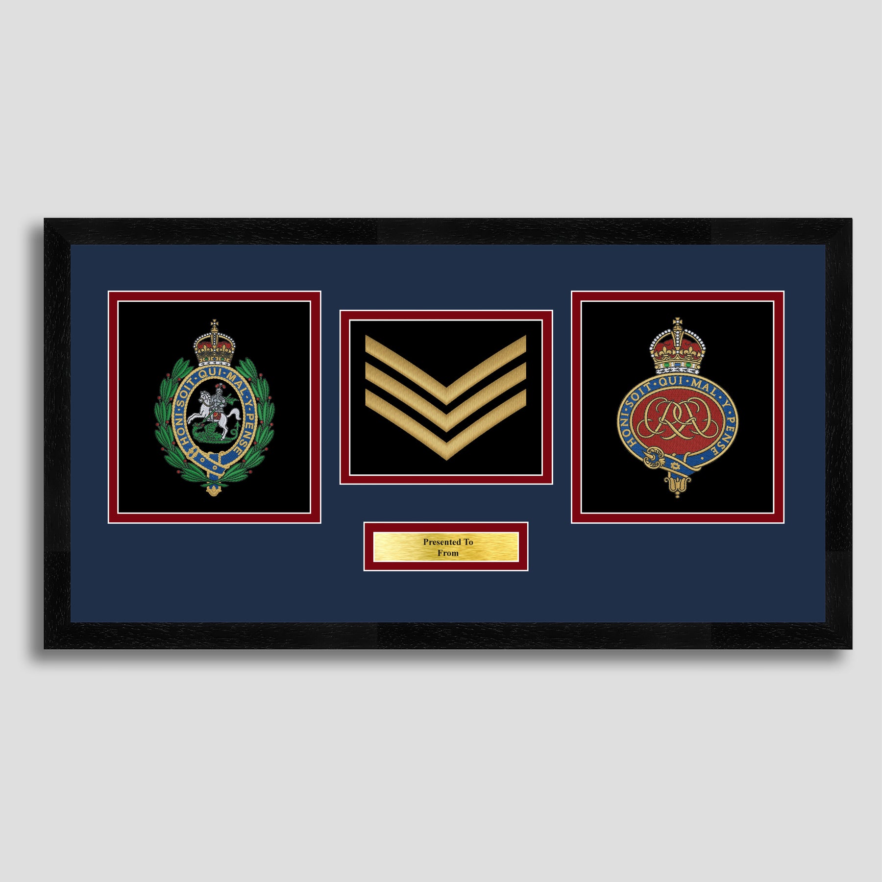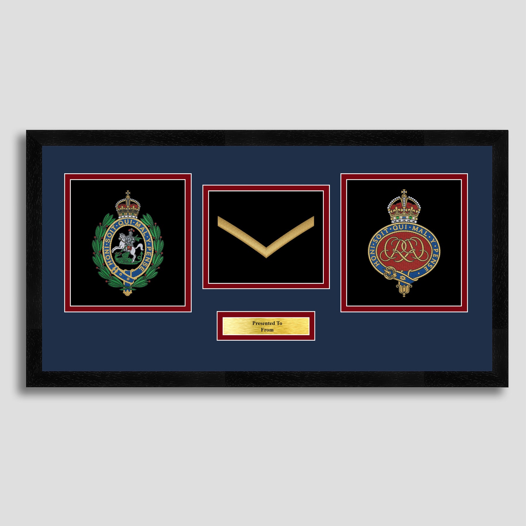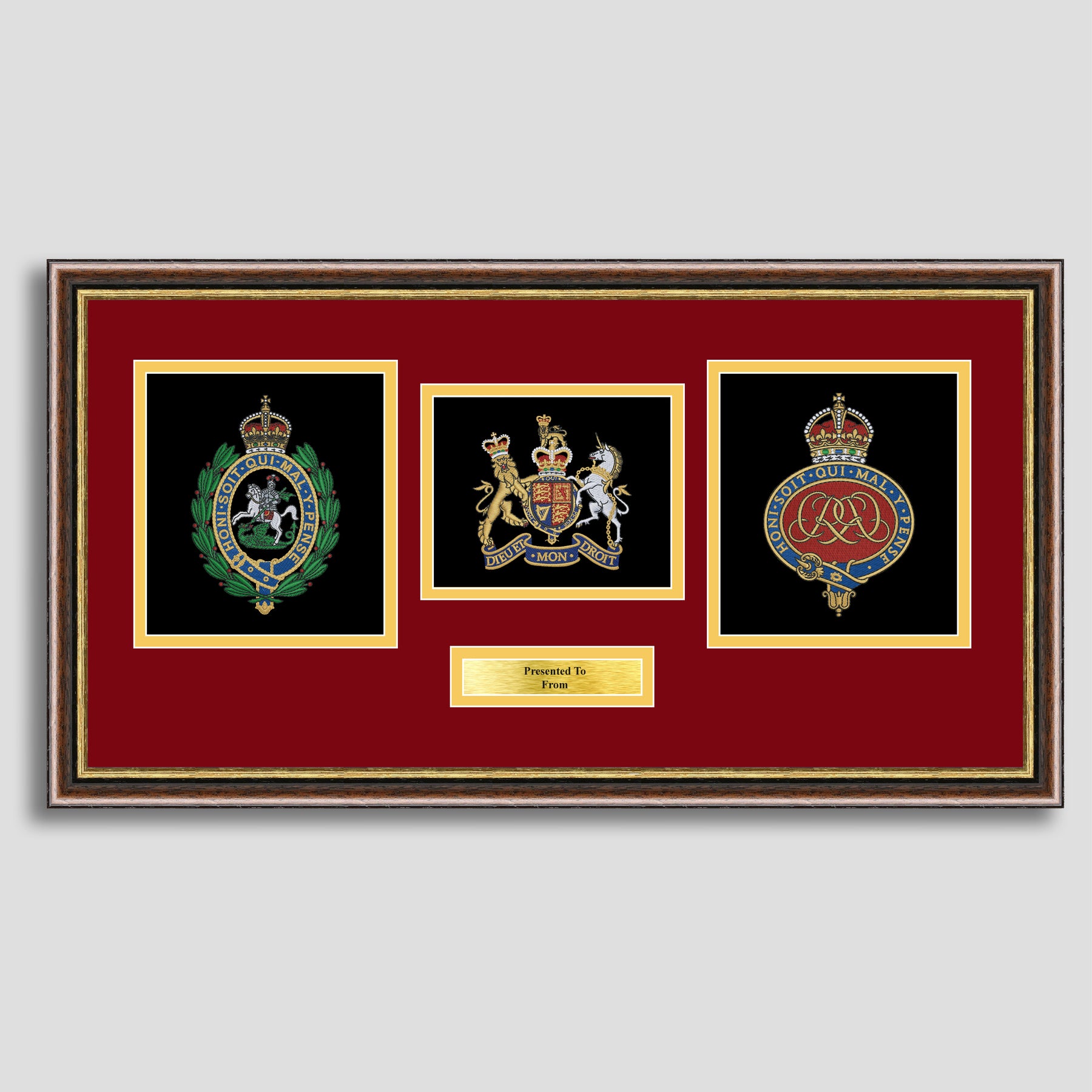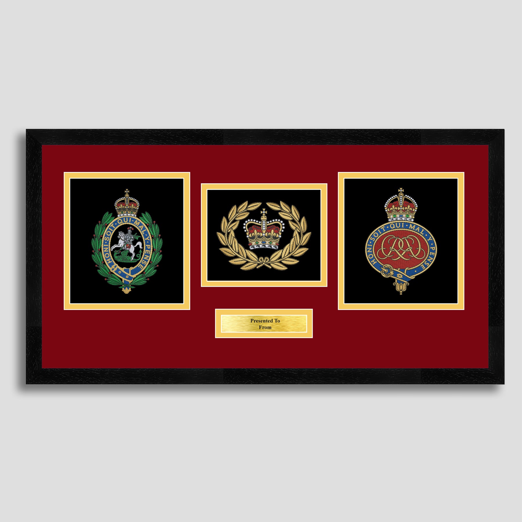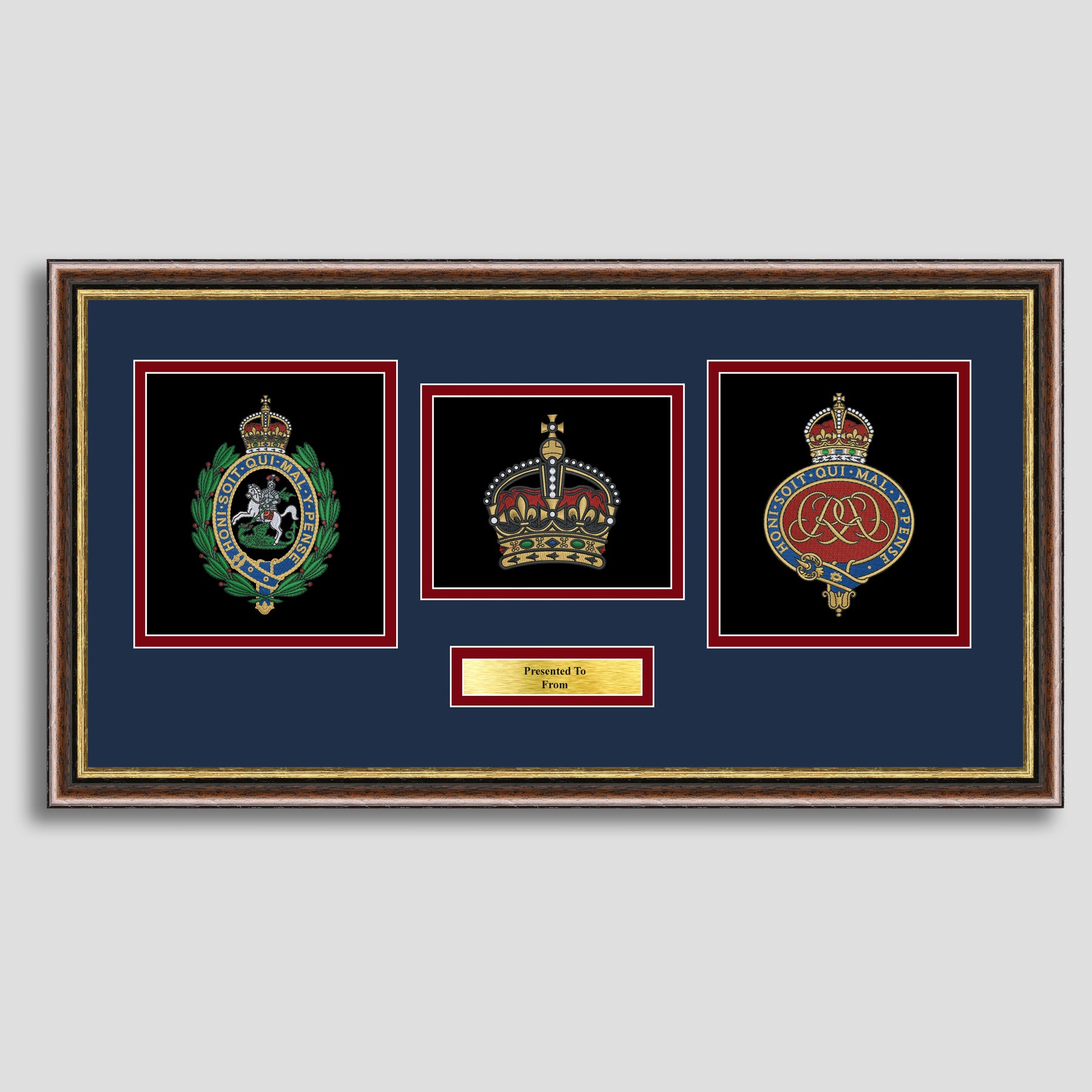 To finish, all our embroidery frames are double mounted to match regiment colours and includes a brass plaque with your own personal message.