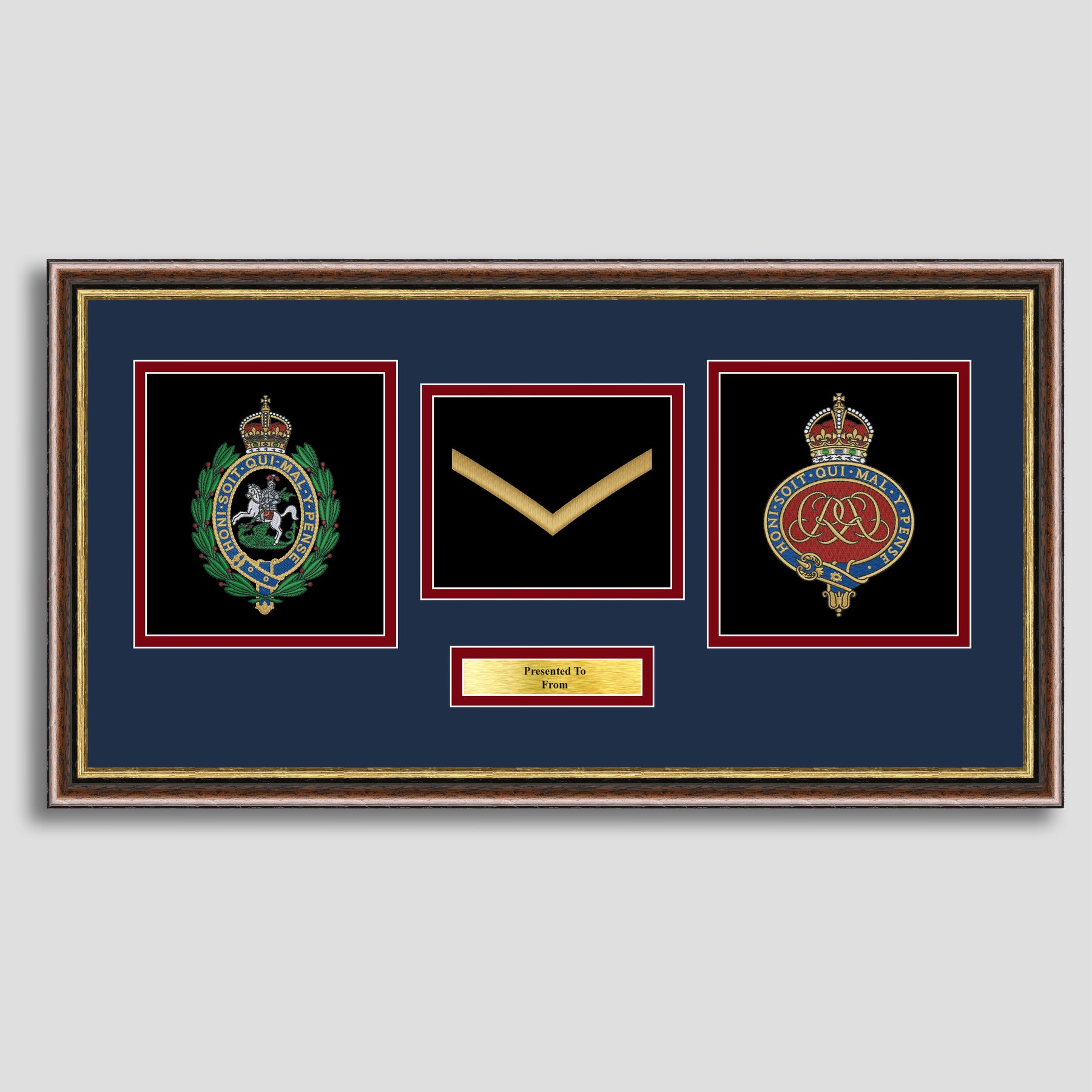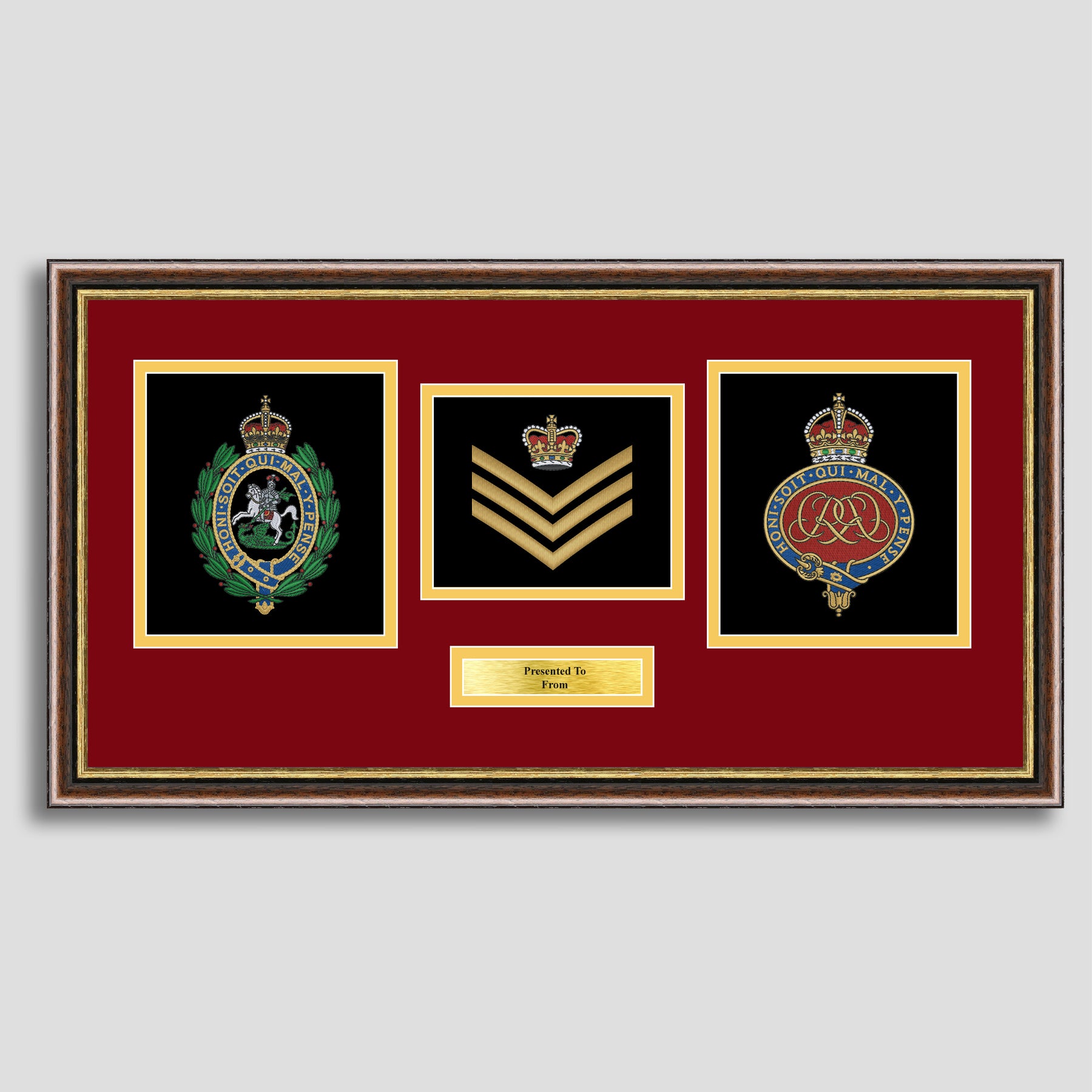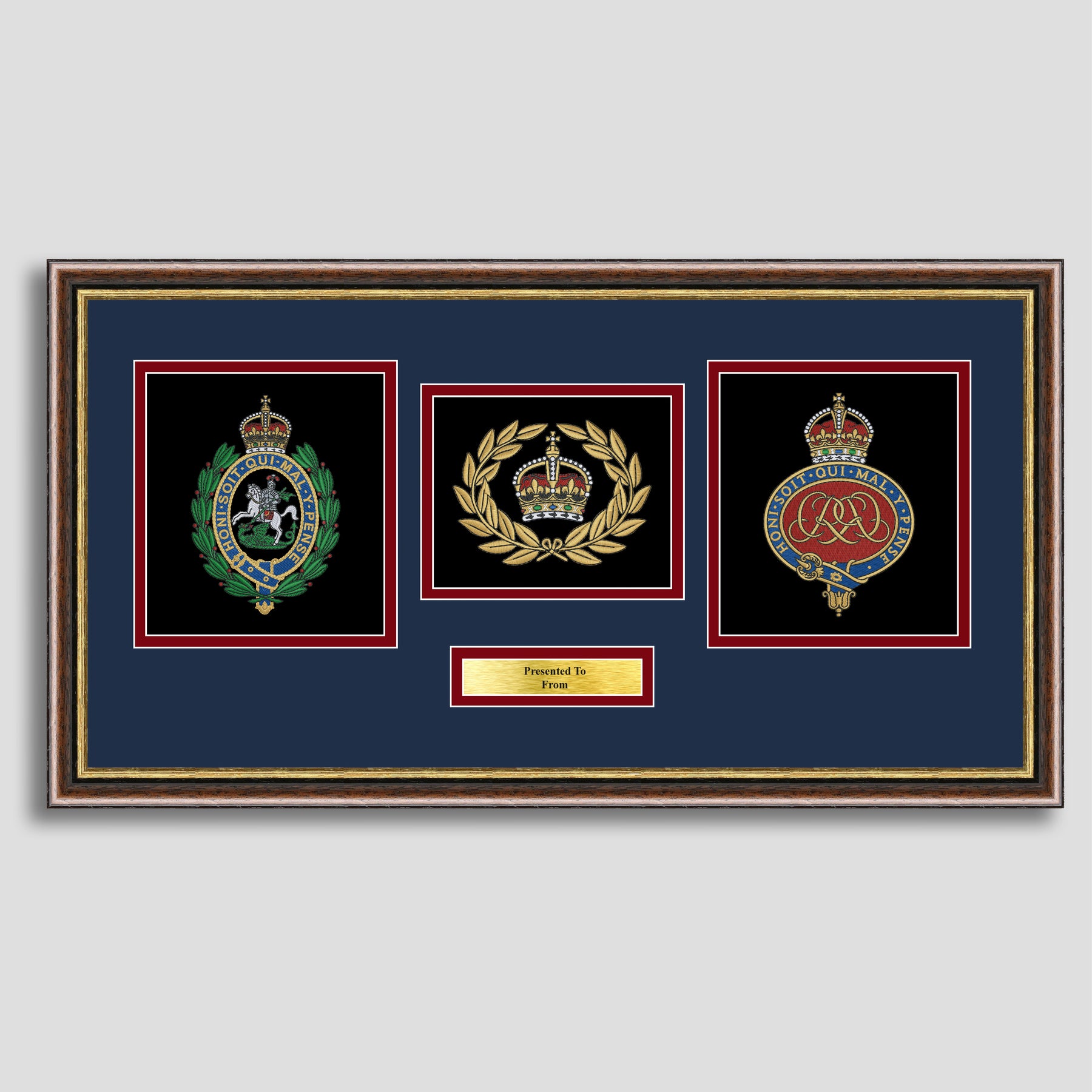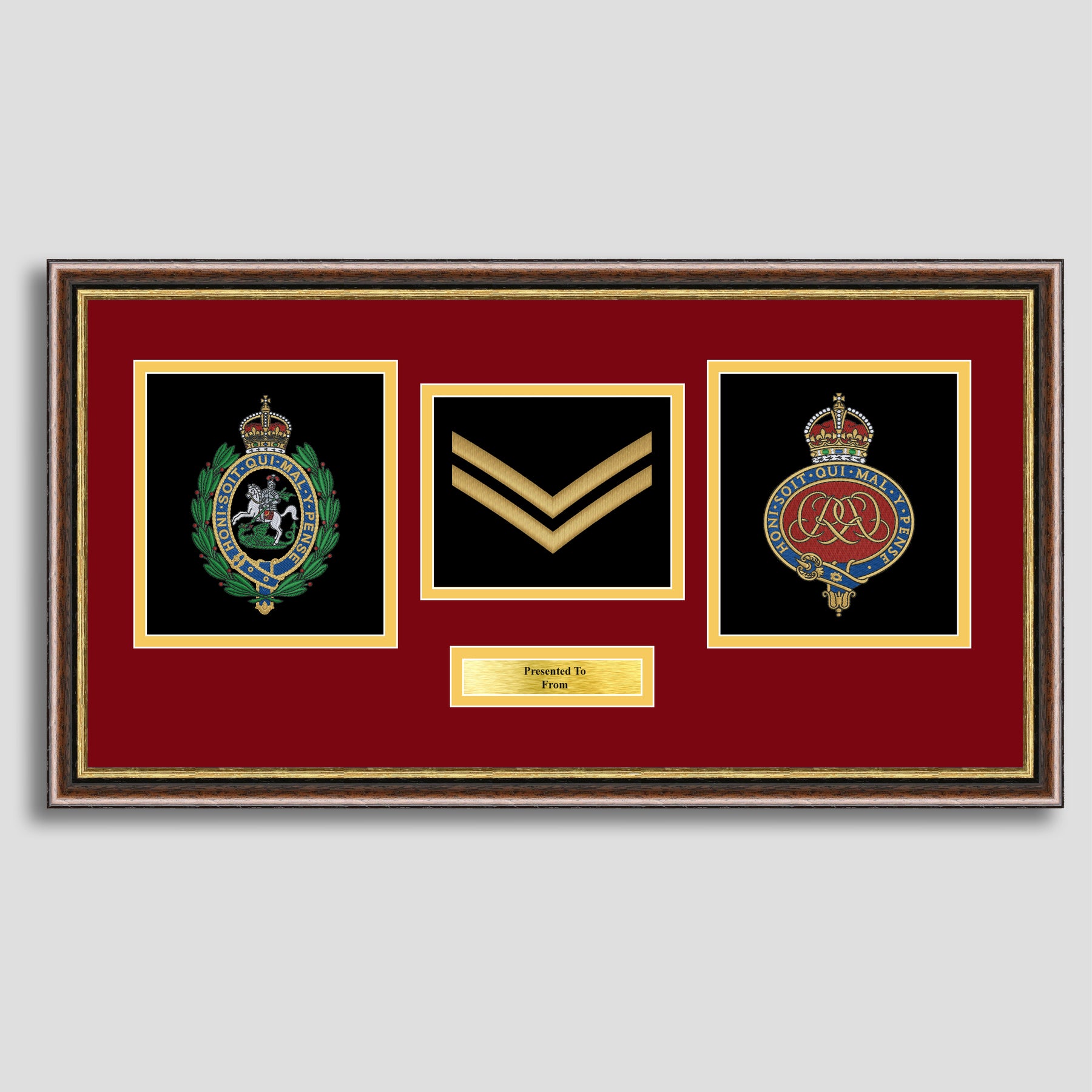 To finish, all our embroidery frames are double mounted to match regiment colours and includes a brass plaque with your own personal message.