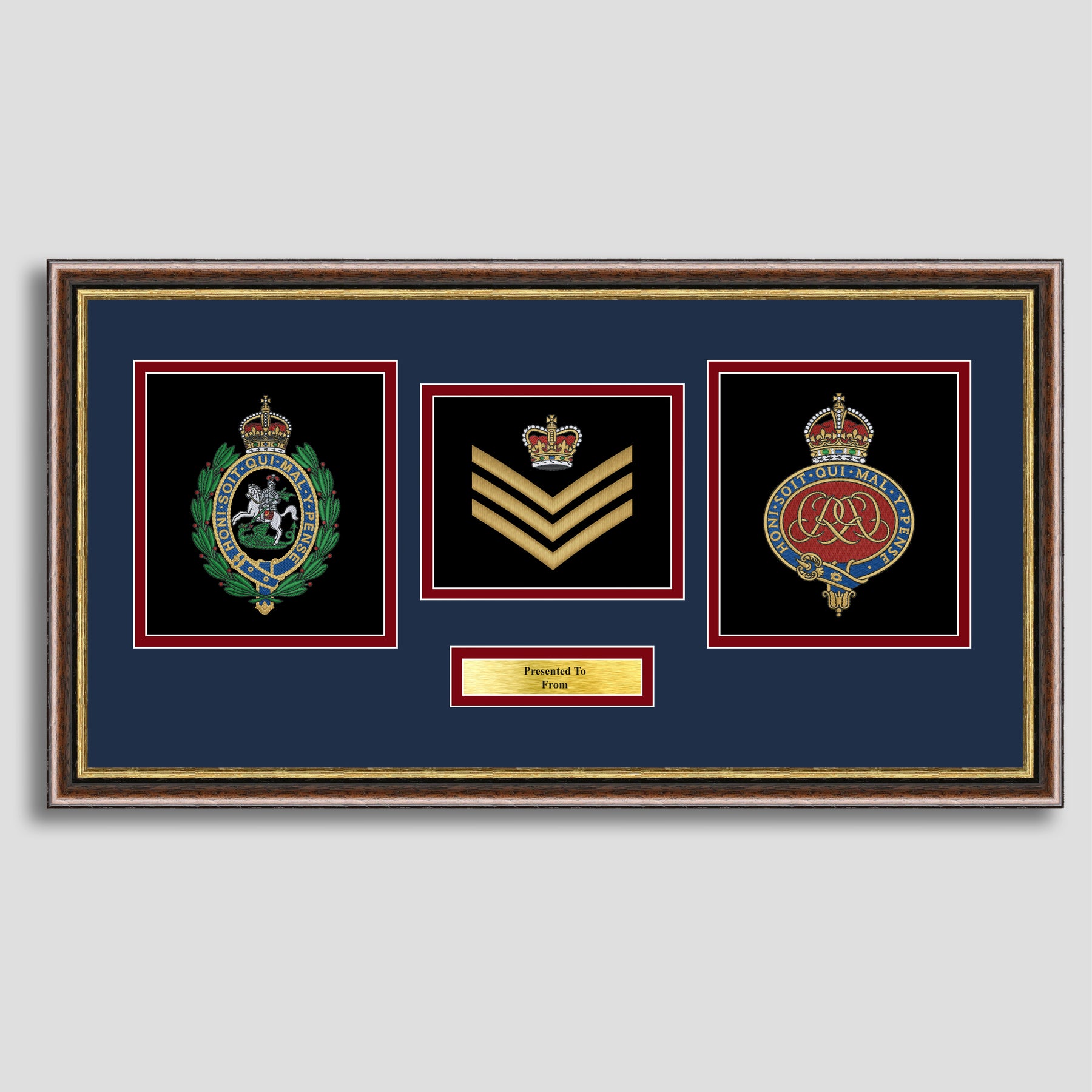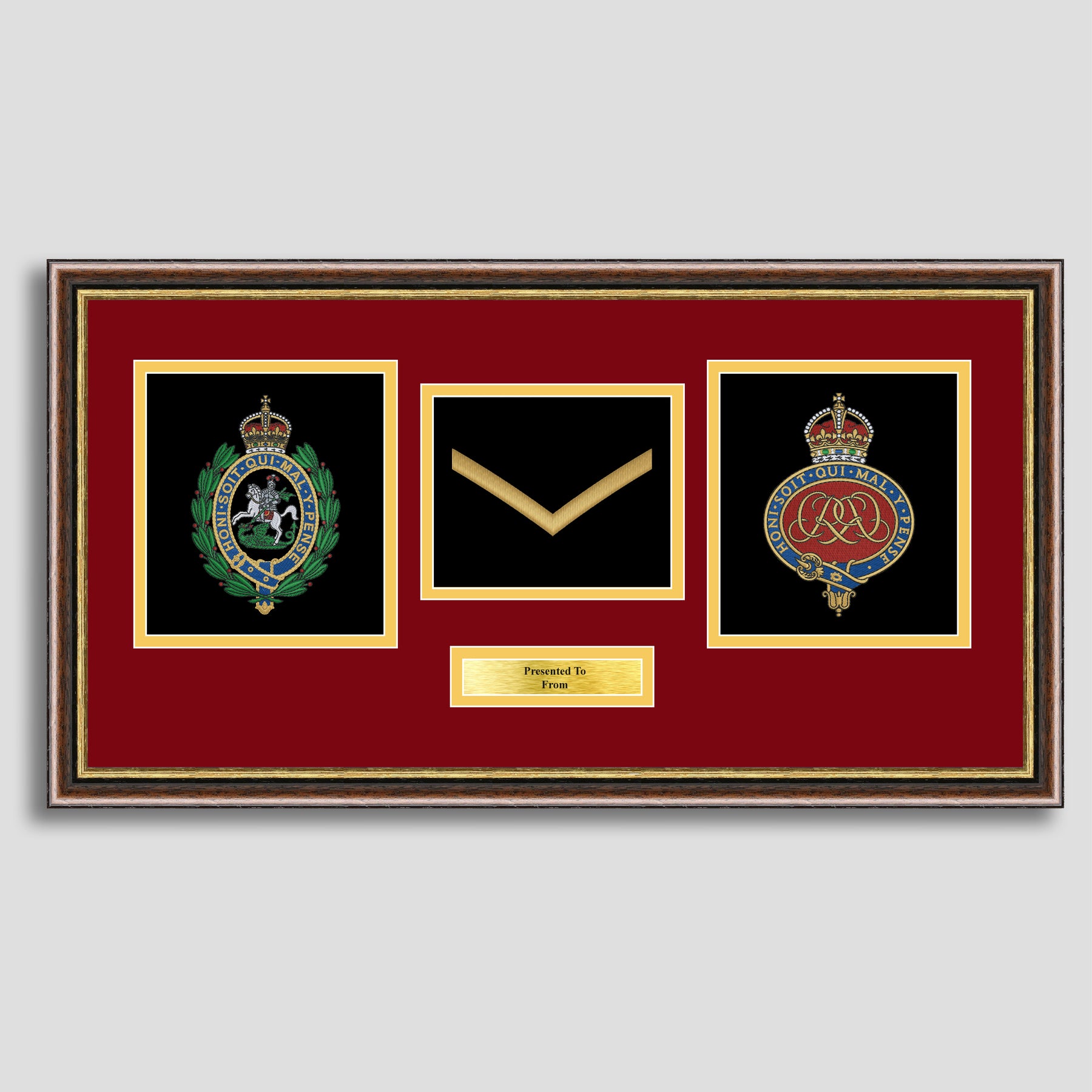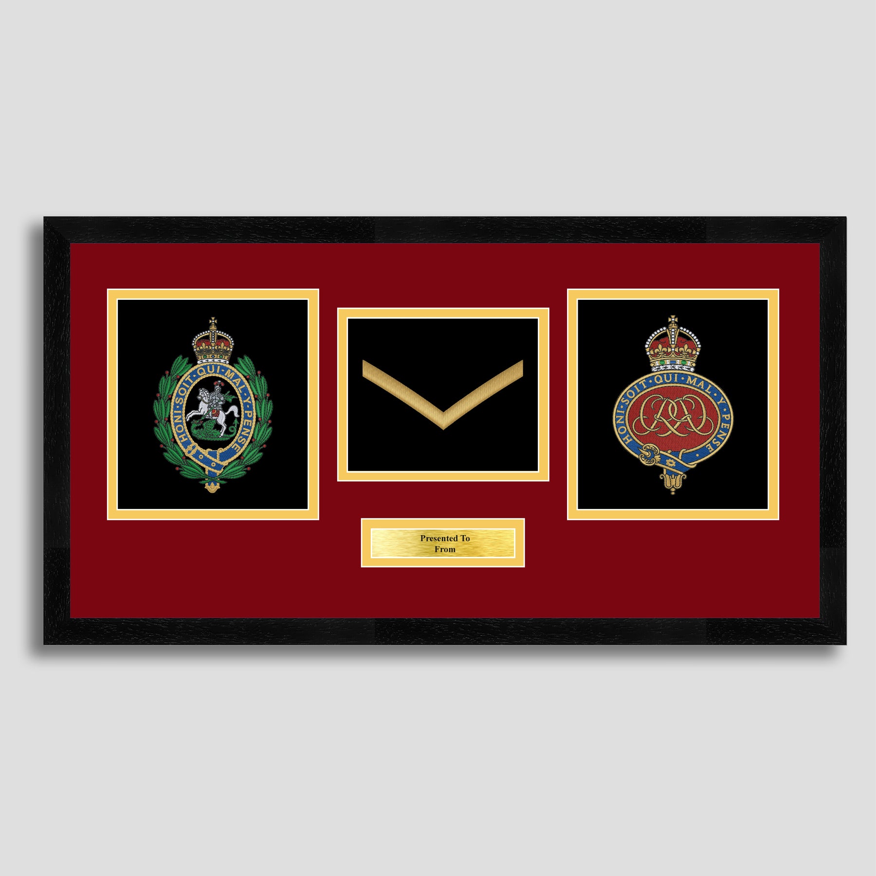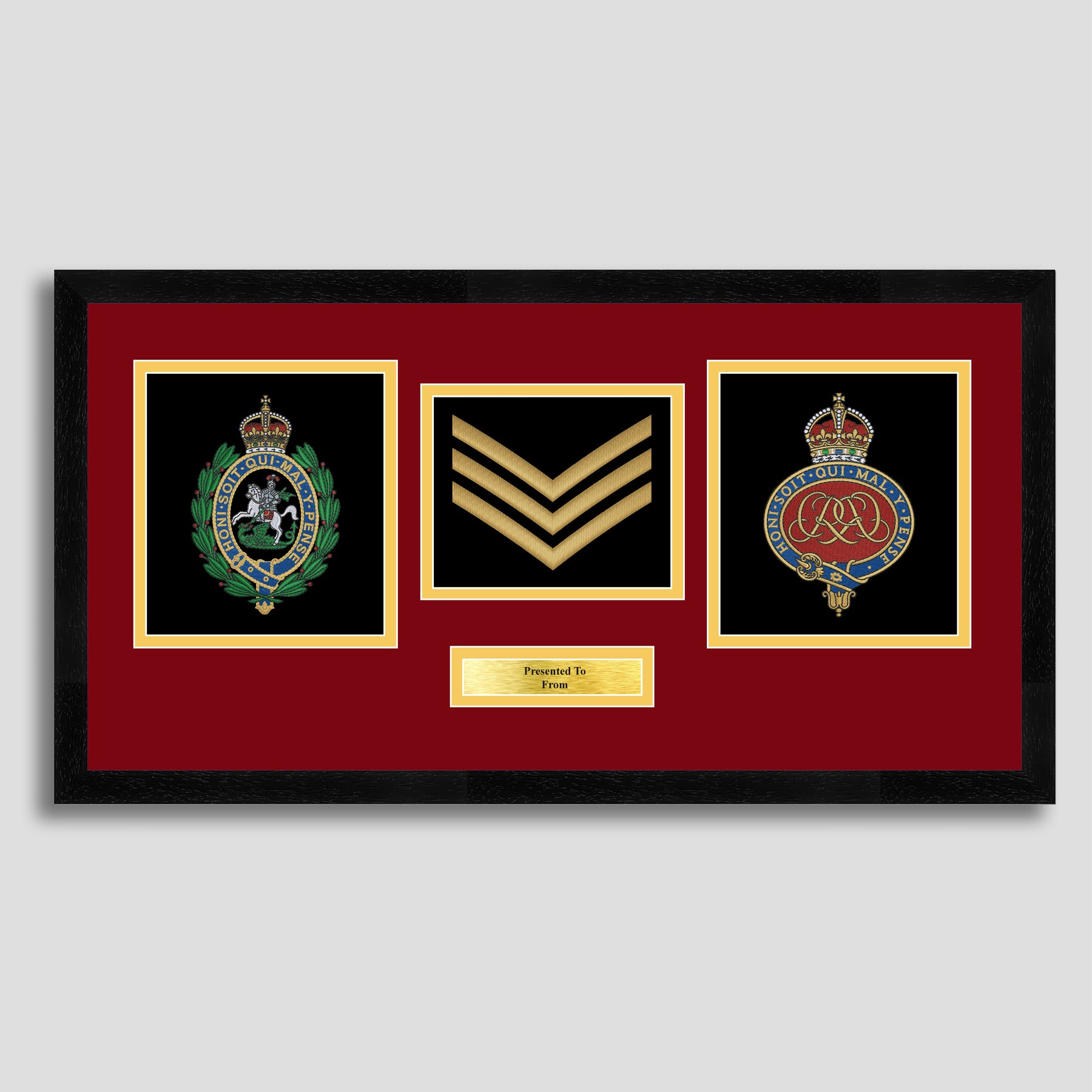 To finish, all our embroidery frames are double mounted to match regiment colours and includes a brass plaque with your own personal message.