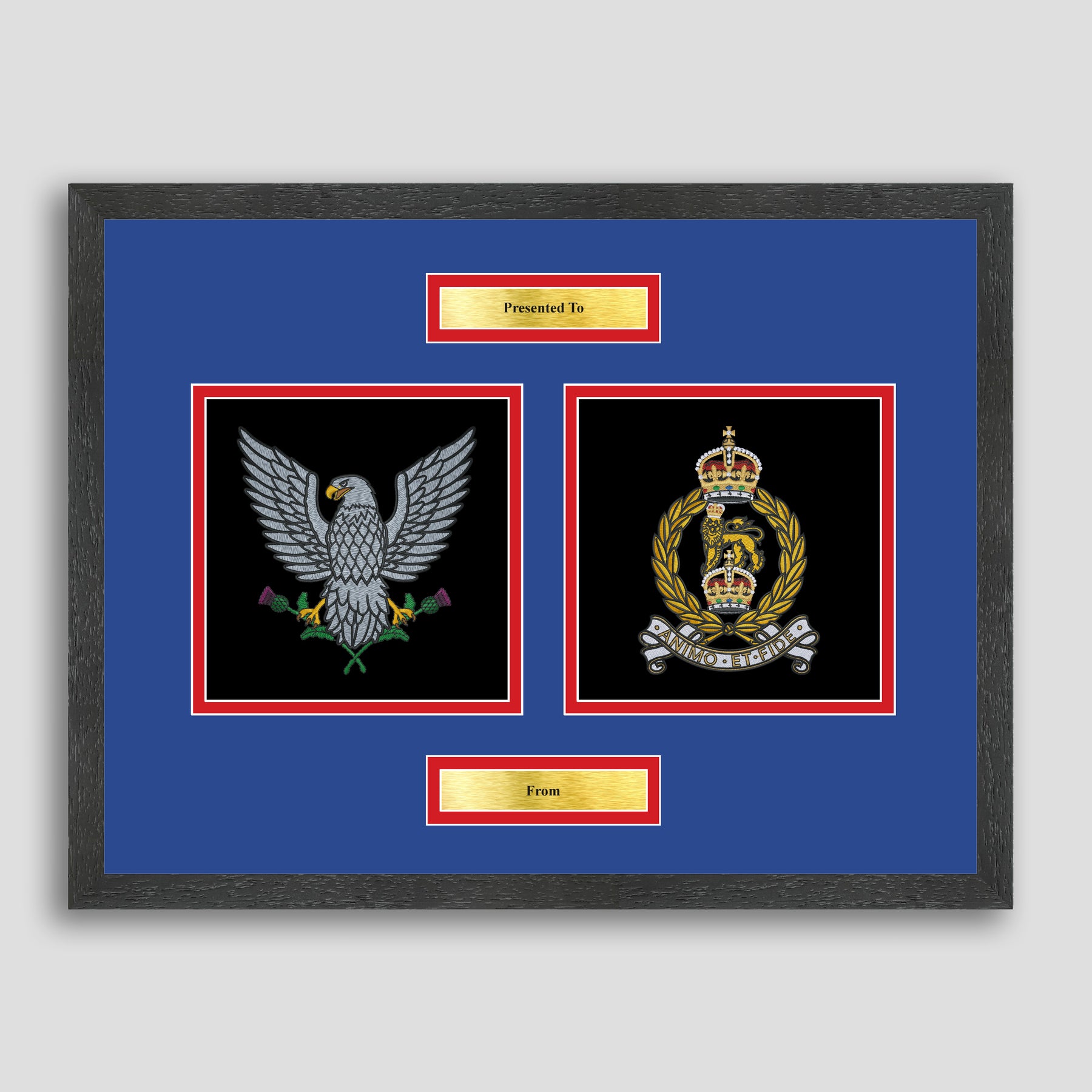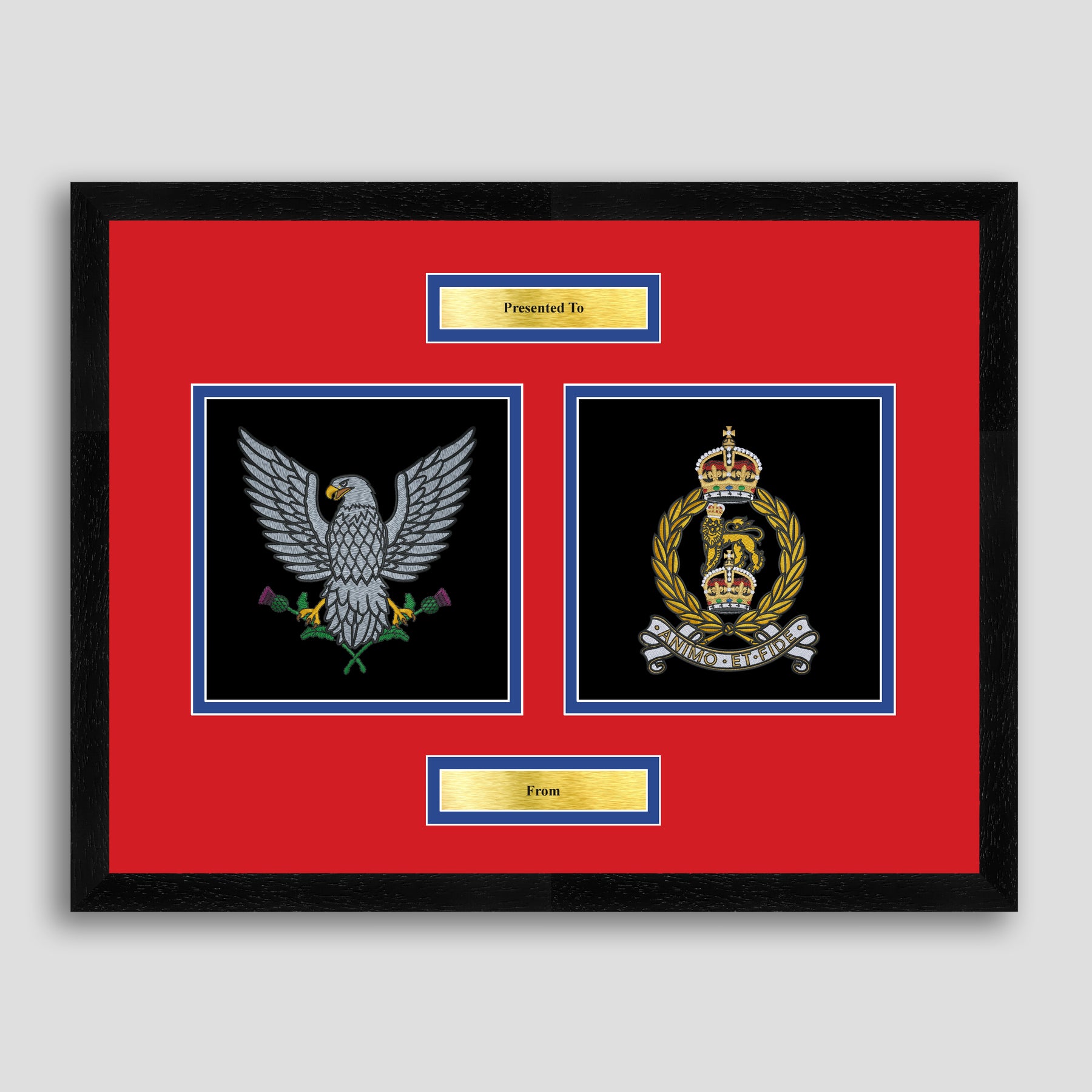 To finish, all our embroidery frames are double mounted to match regiment colours and include a double brass plaque with your own personal message.