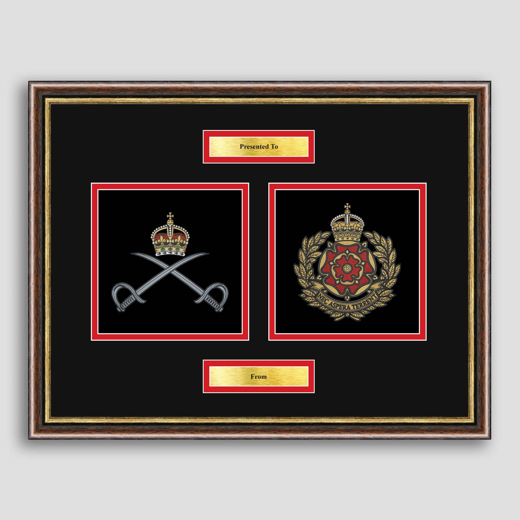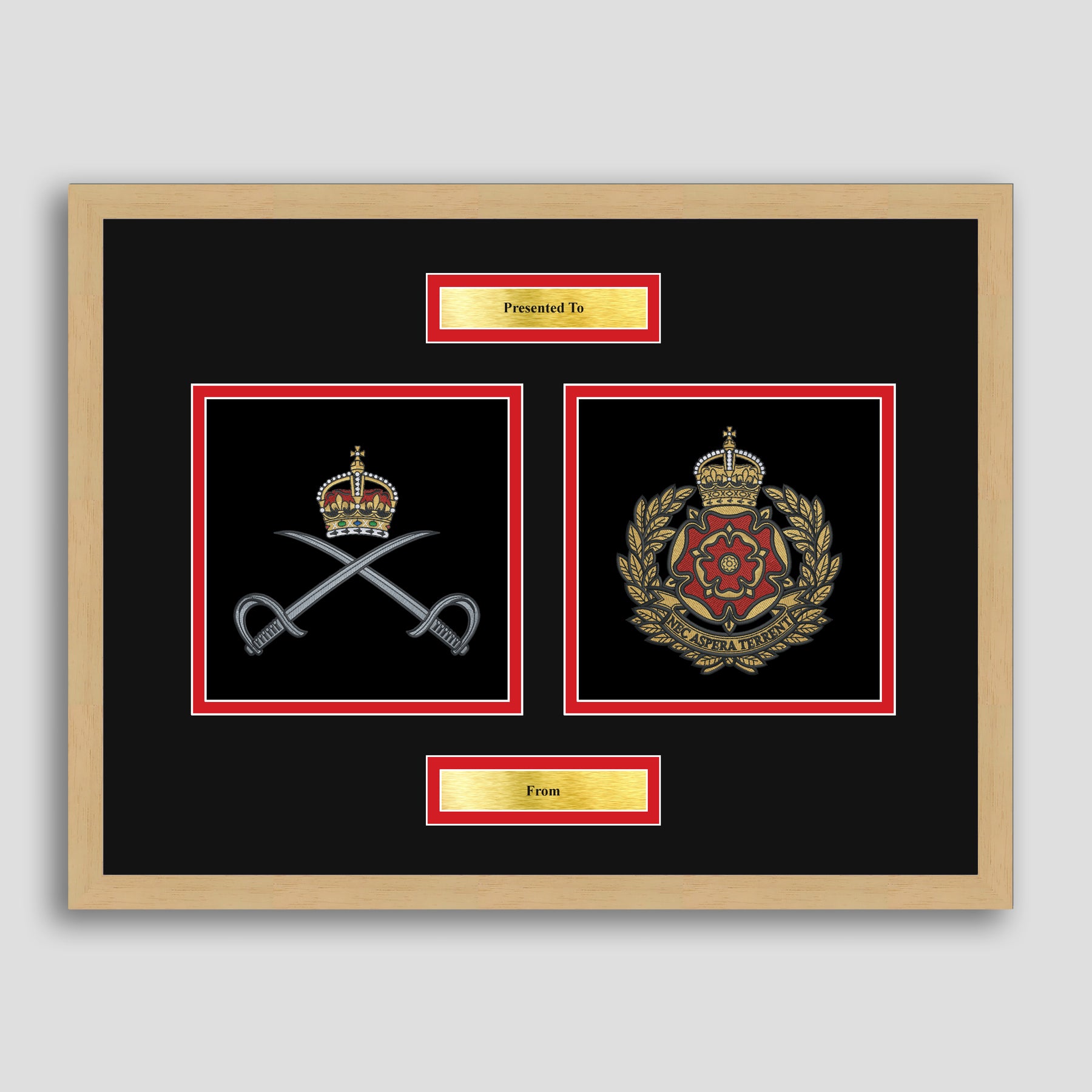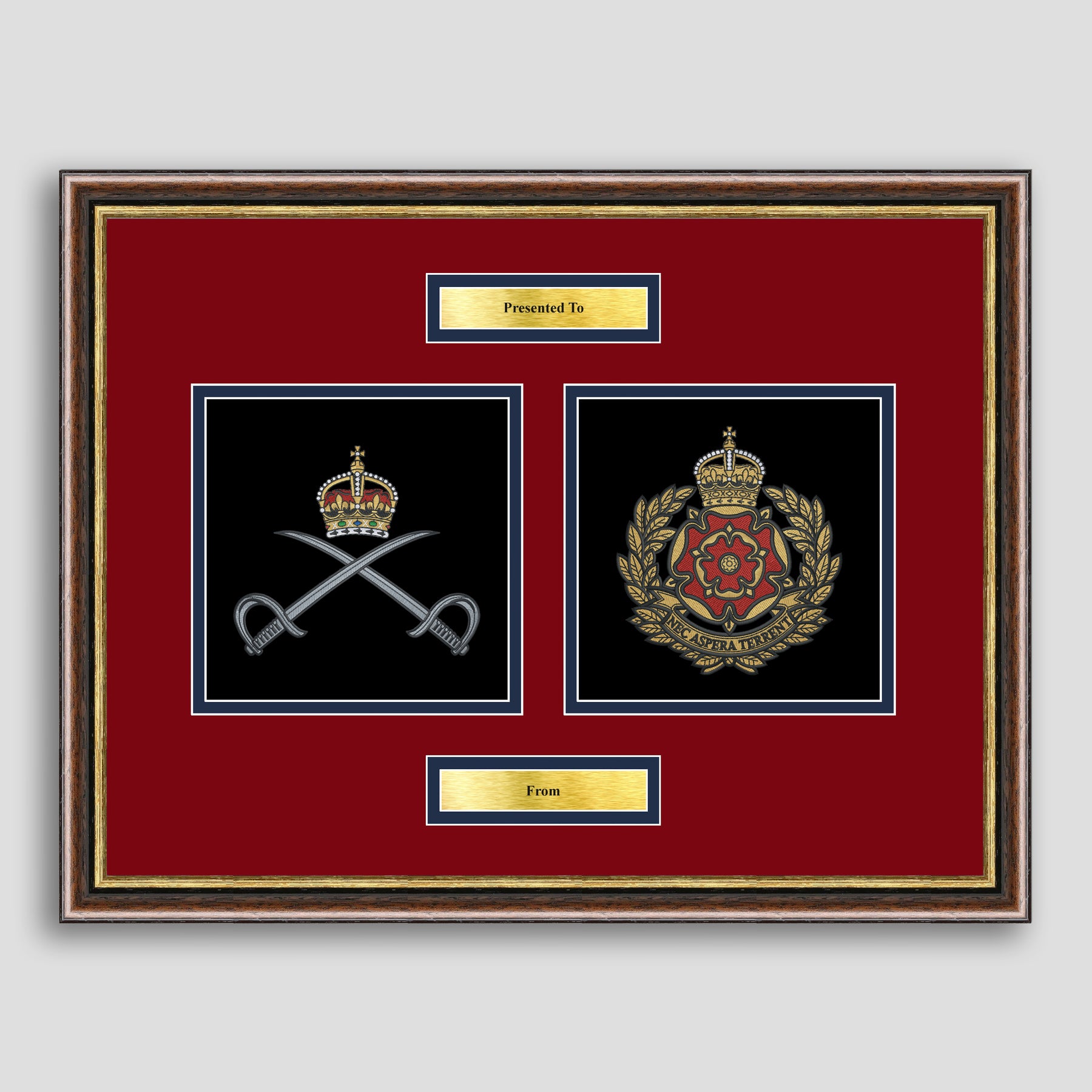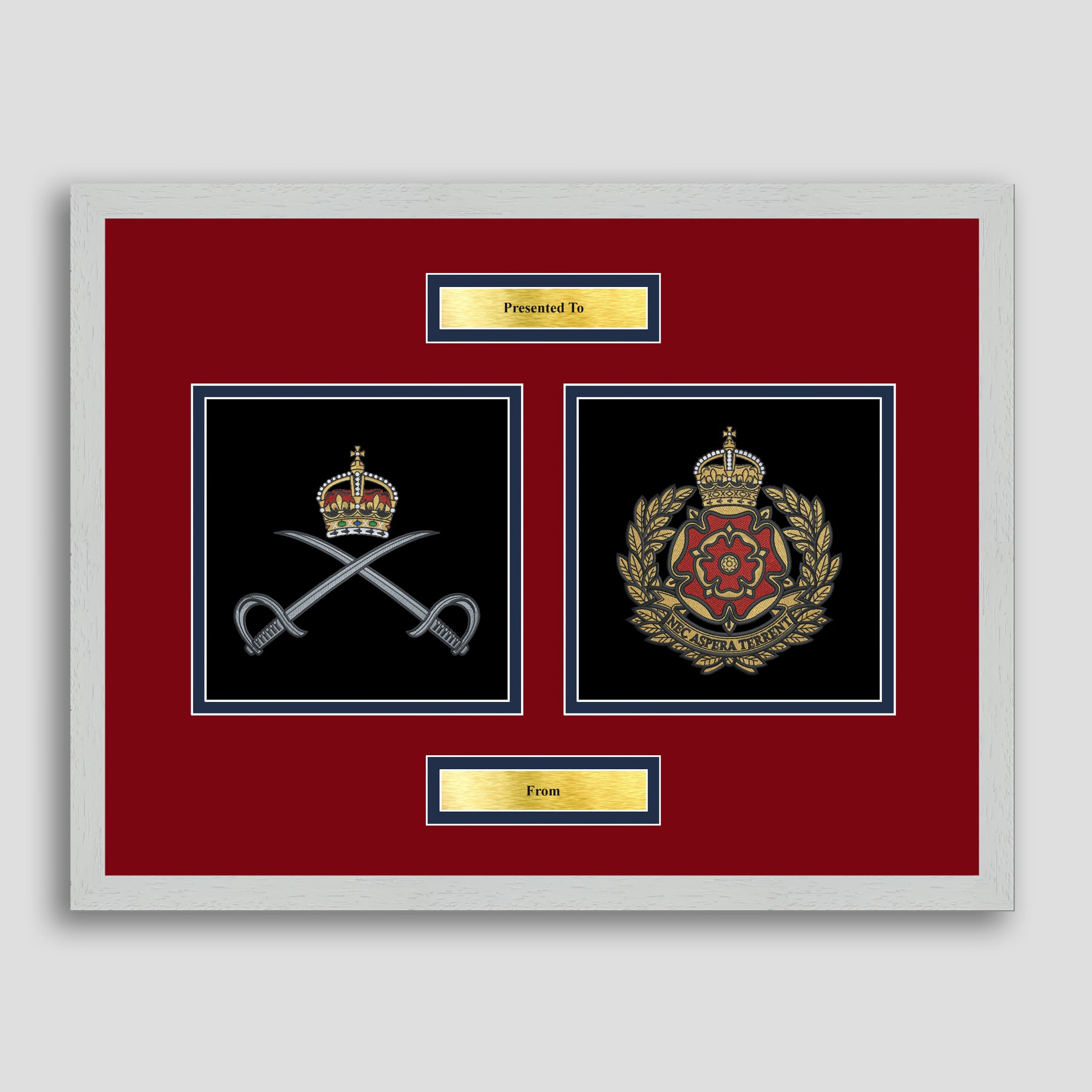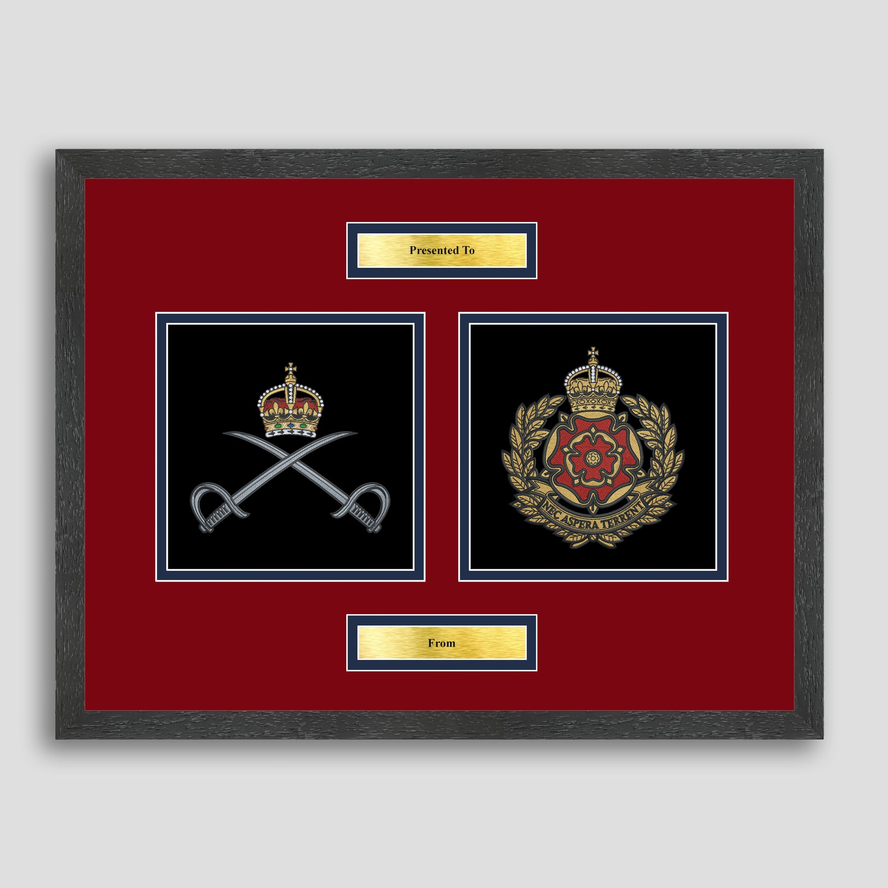 To finish, all our embroidery frames are double mounted to match regiment colours and include a double brass plaque with your own personal message.