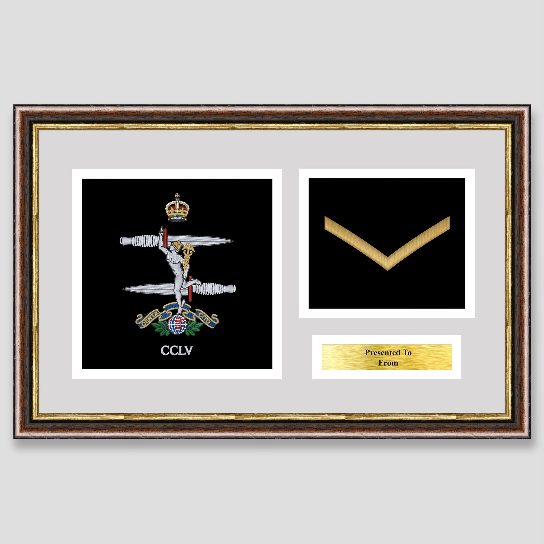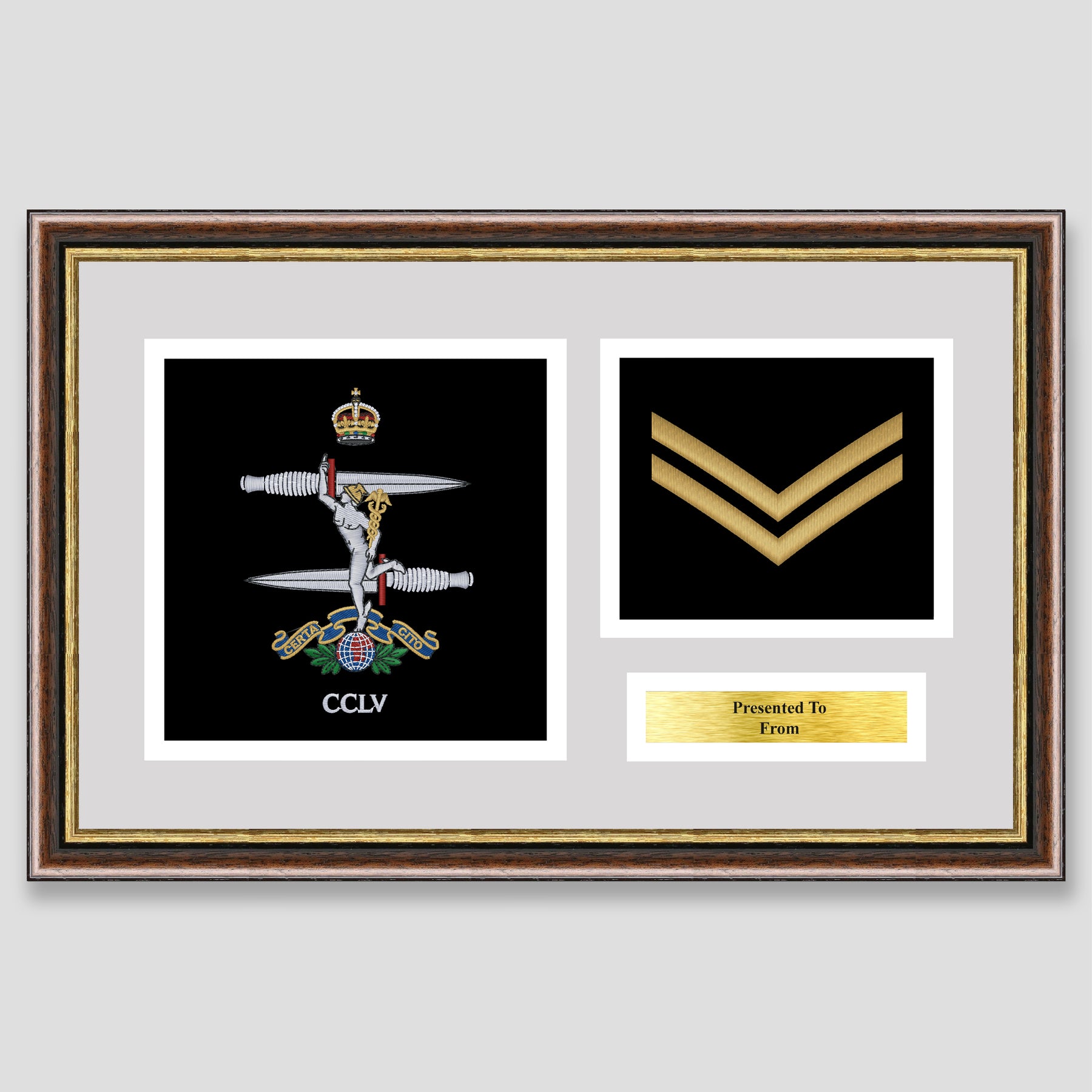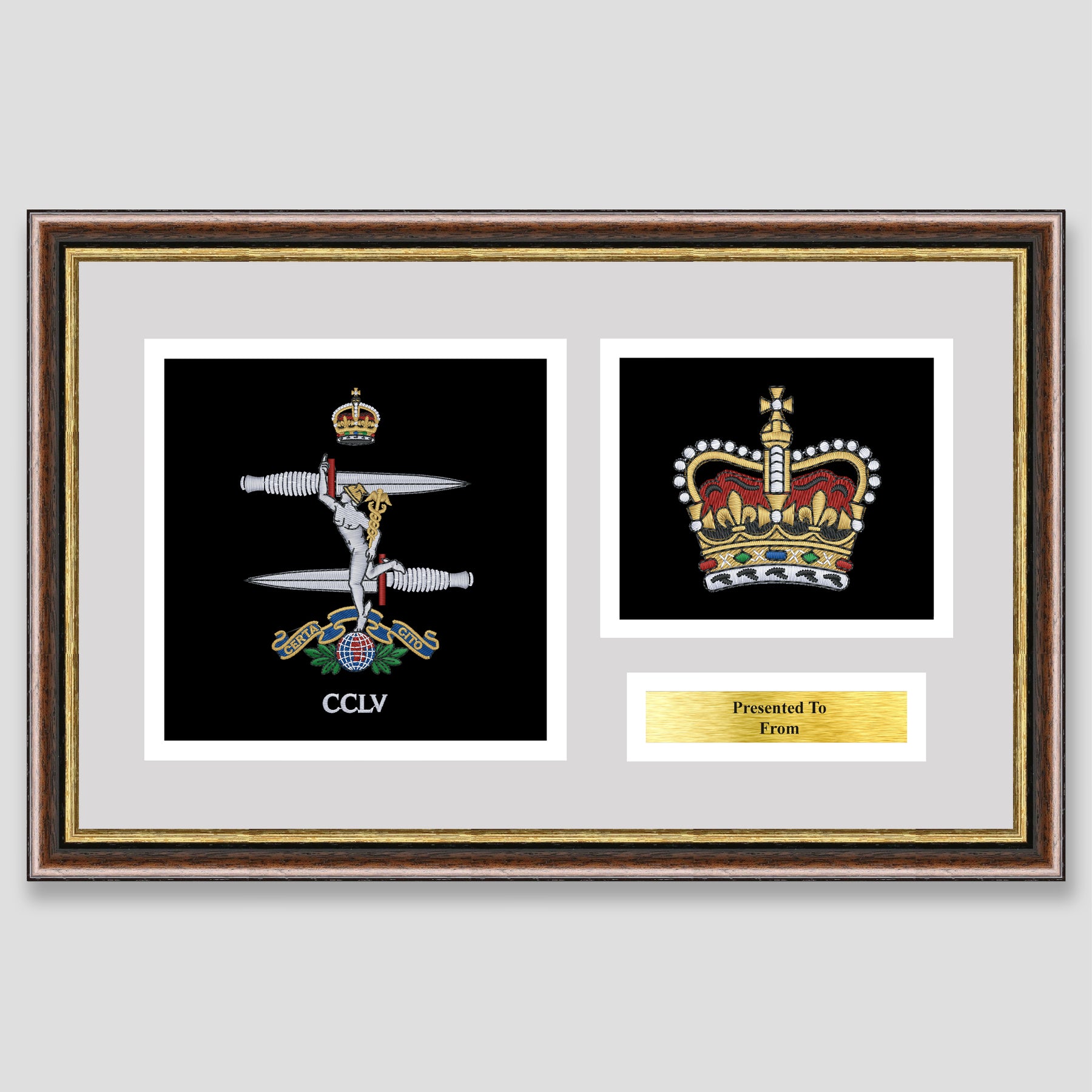 To finish, all our embroidery frames are double mounted to match regiment colours and includes a brass plaque with your own personal message.