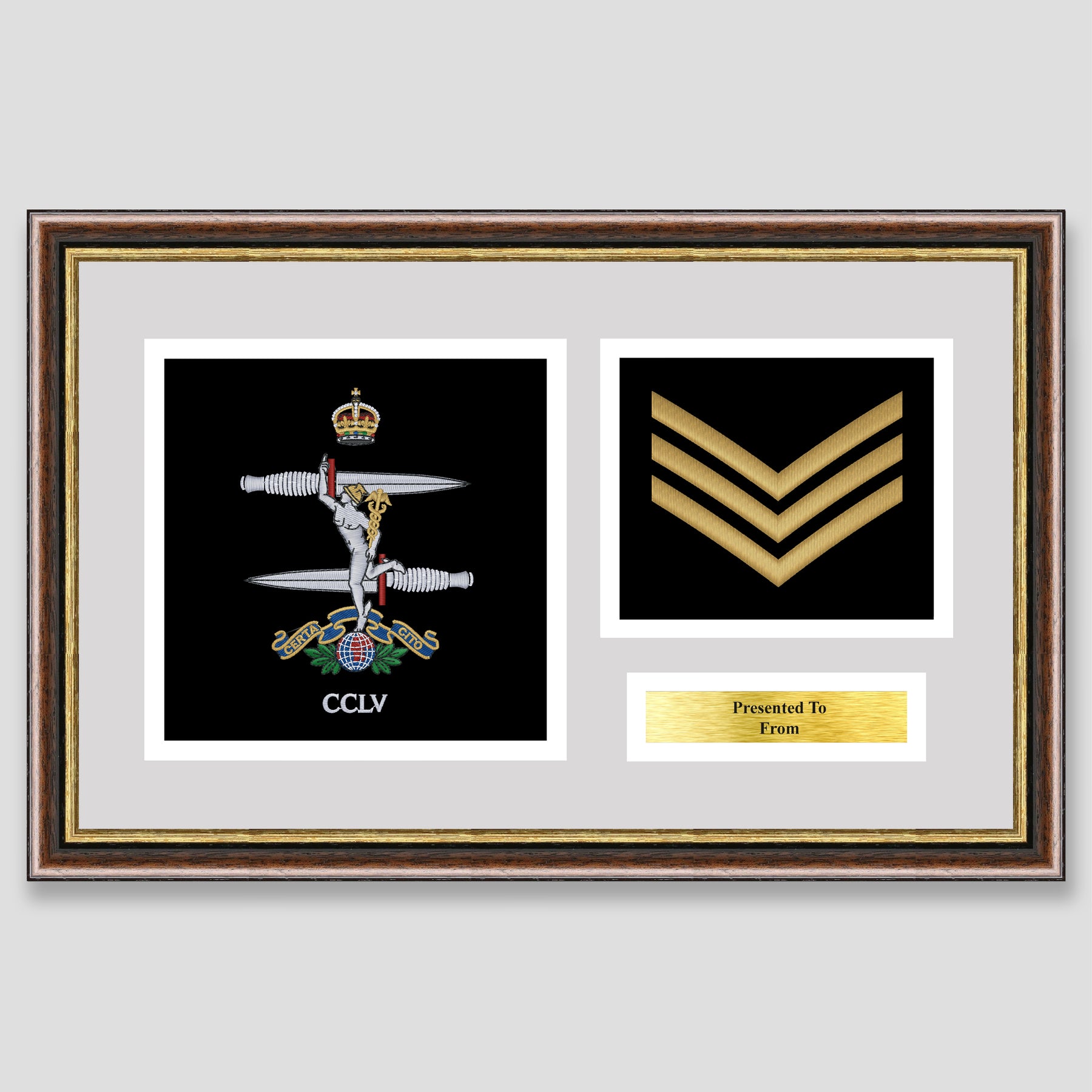 Our embroideries make excellent mess presentation pieces, which are available in a traditional brown and gold style military frame as well as modern contemporary finishes. The inclusion of a rank makes this a very personal gift, and a product with an overall size of 14x8.5 inches. More size information can be found in our tech specs tab below.