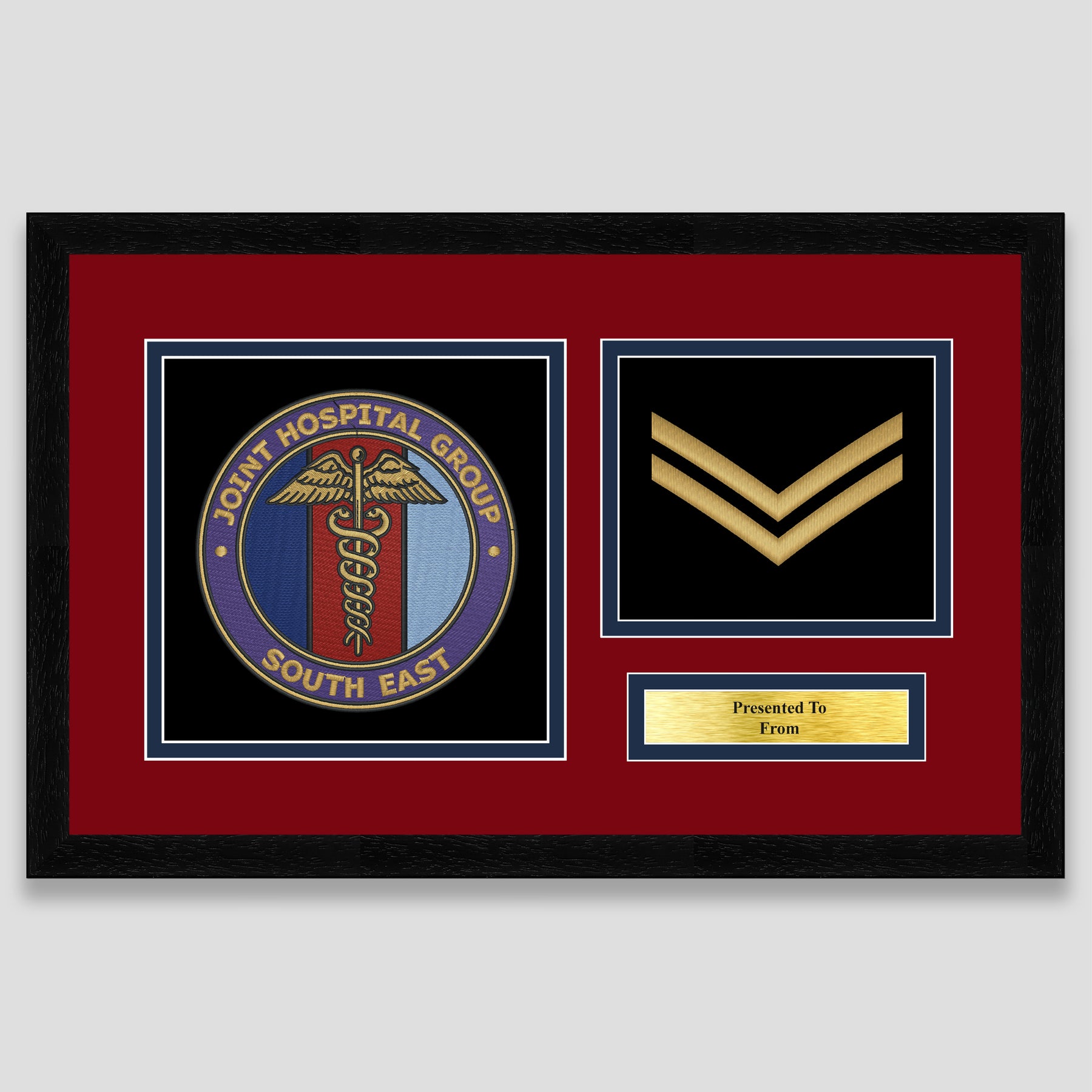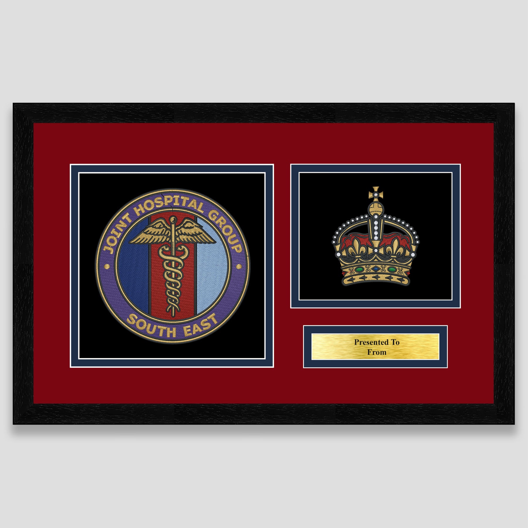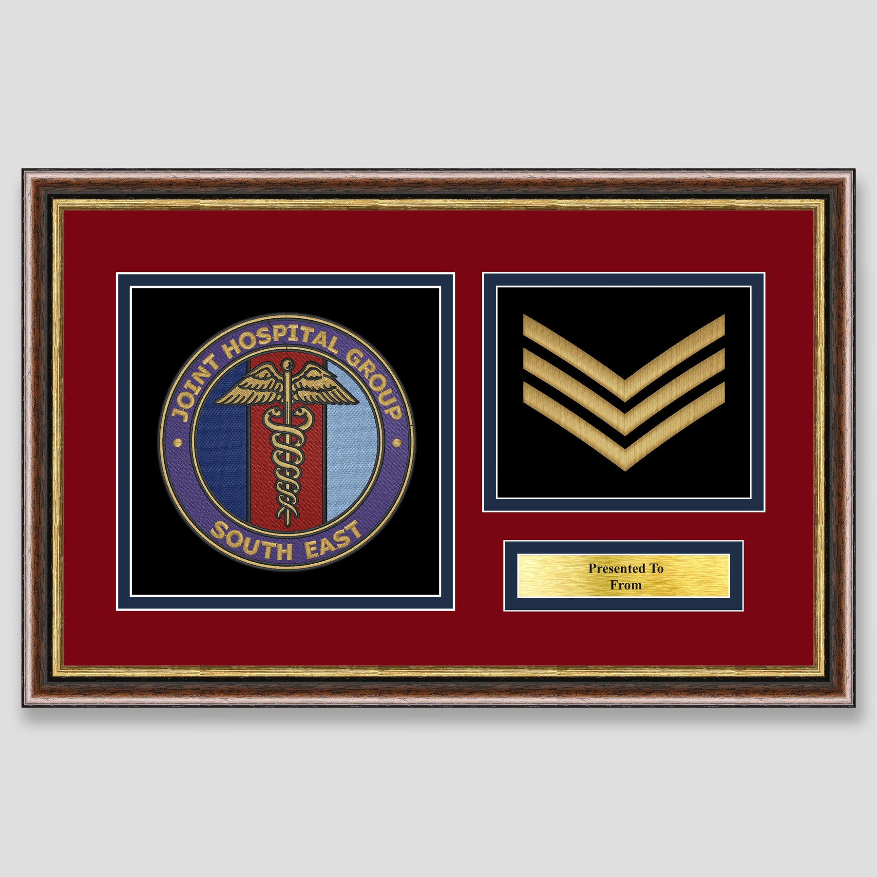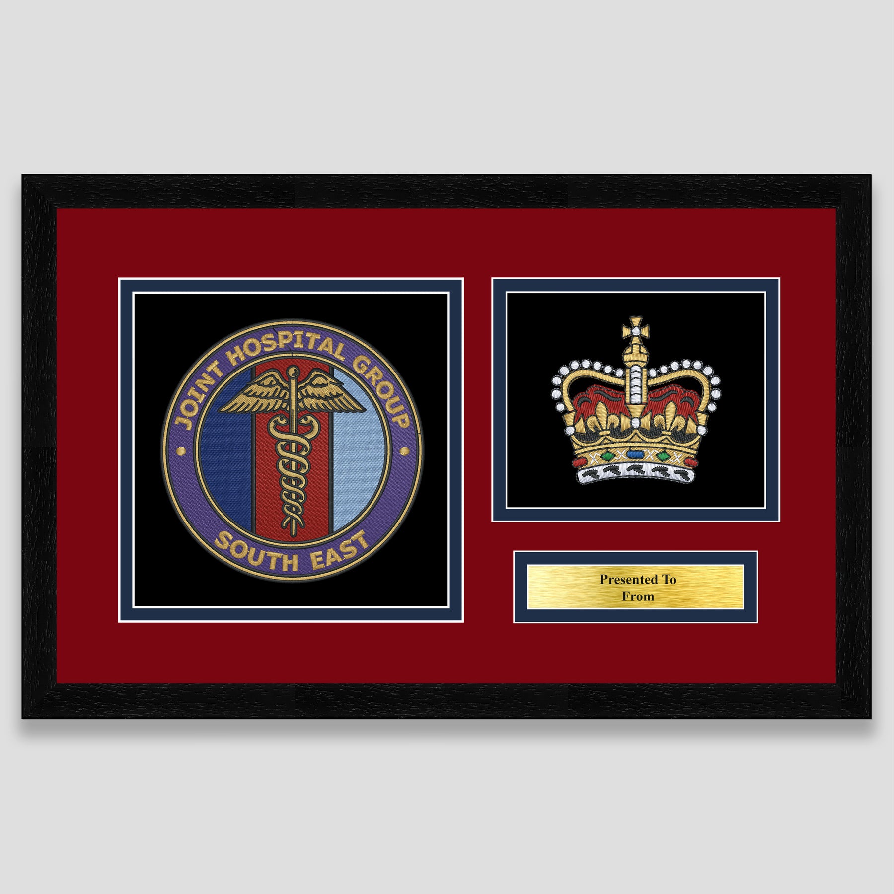 Military embroidery presentation of the Joint Hospital Group South East crest and features a rank. Ideal leaving gift to any service member or veteran and of course, is mounted, framed and finished with a personalised brass plaque.