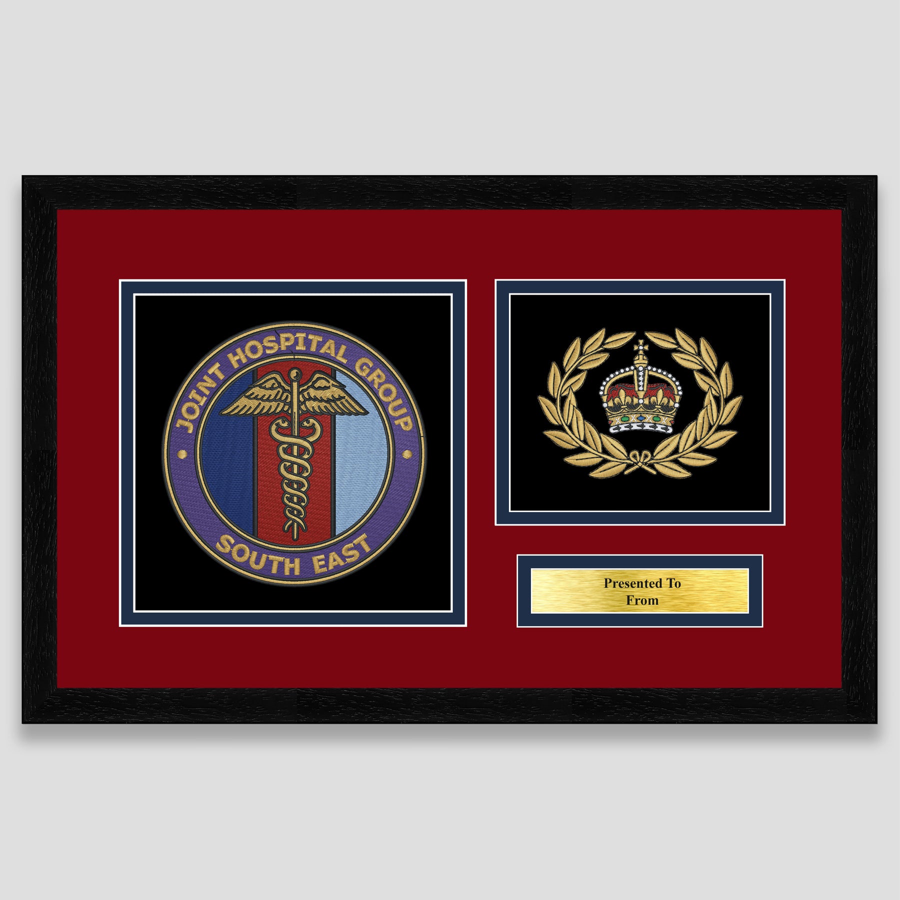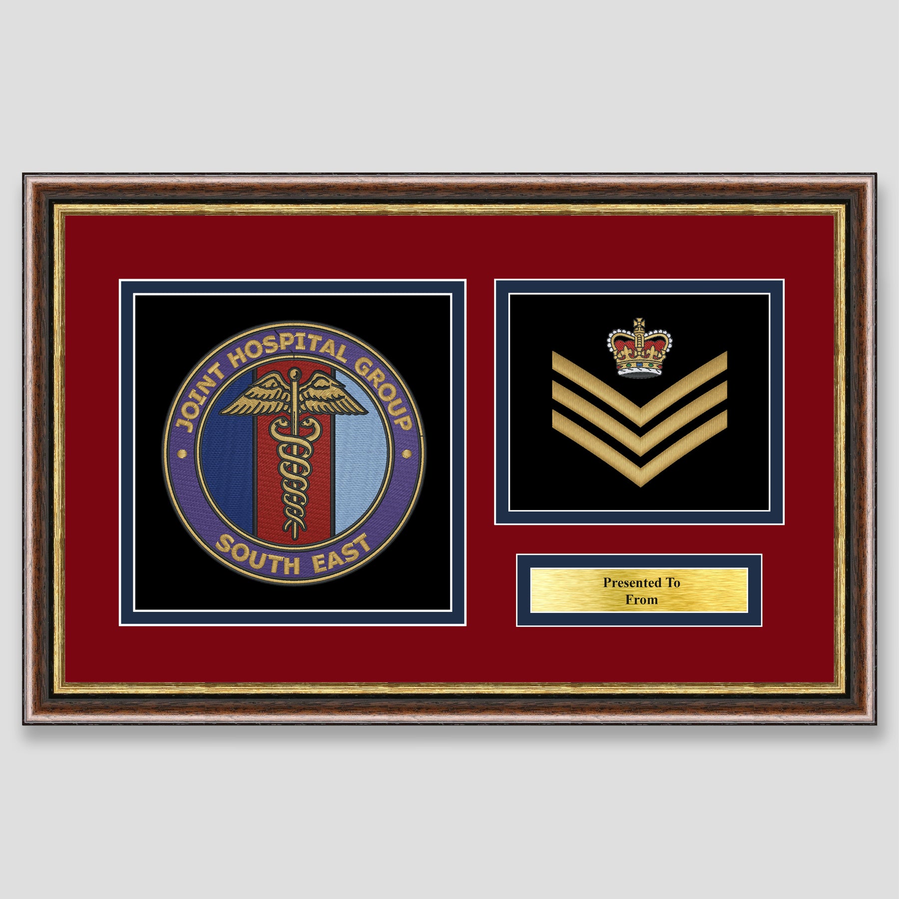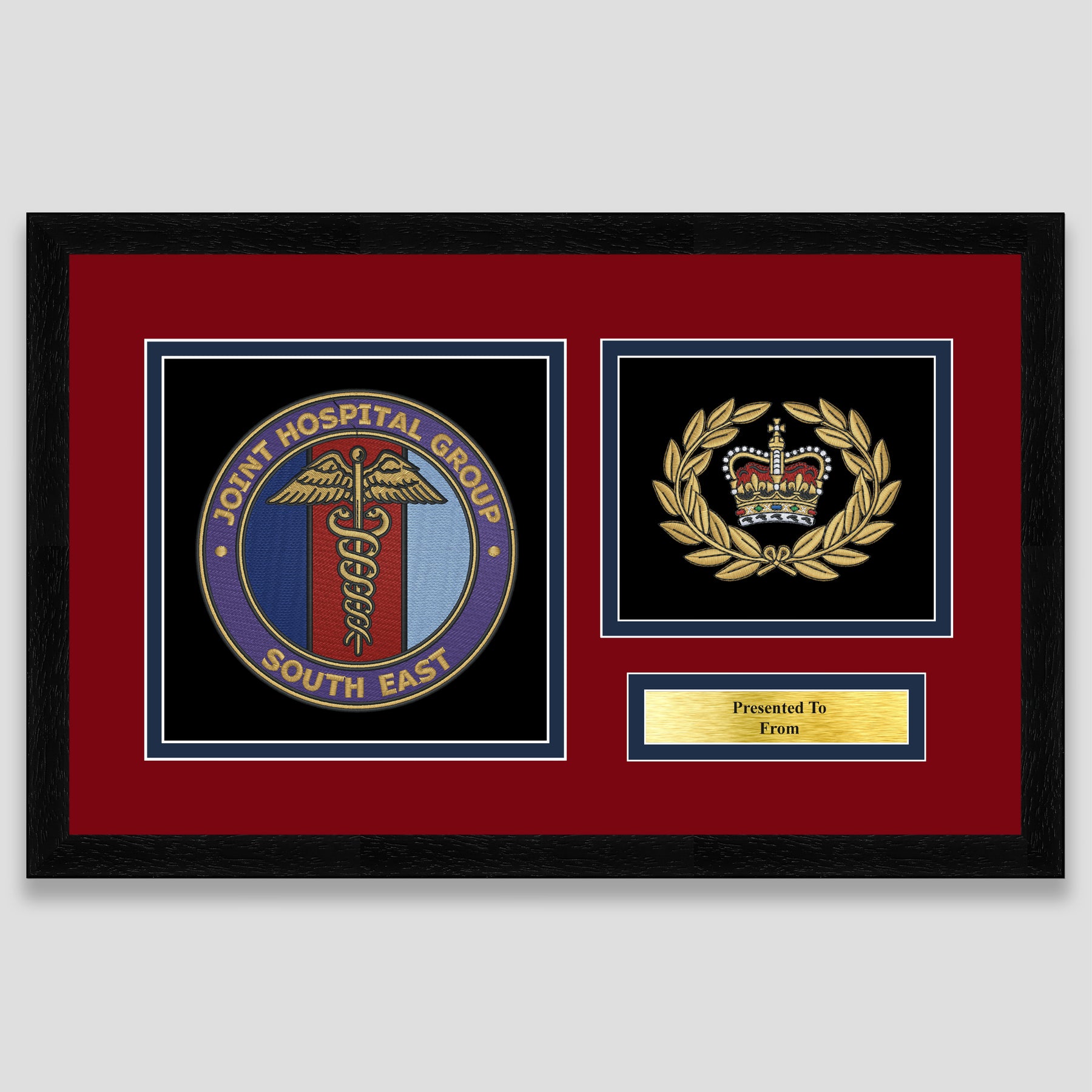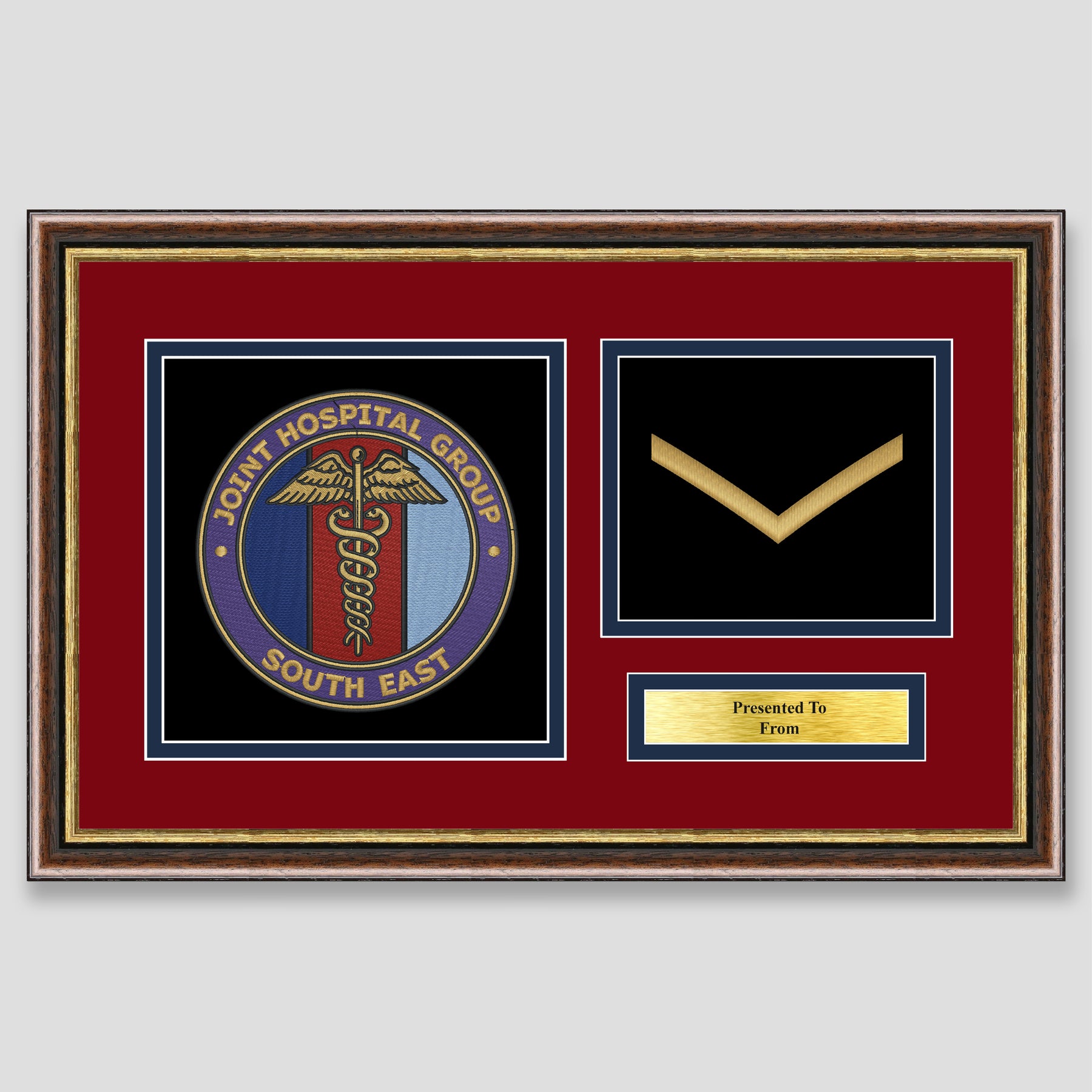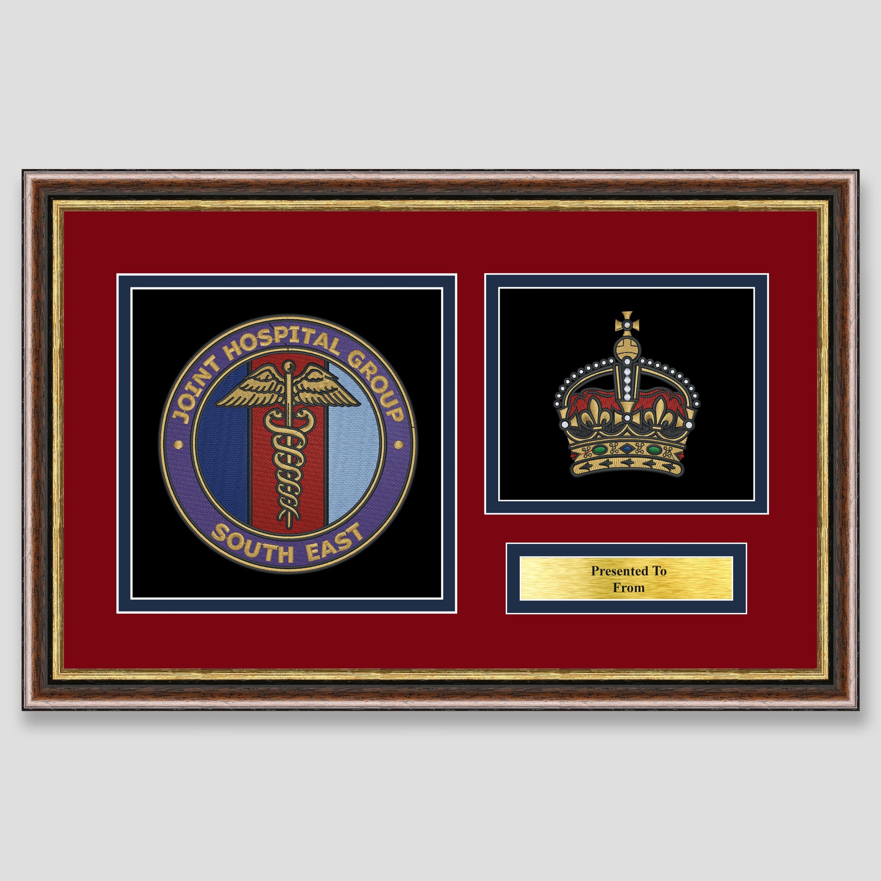 Military embroidery presentation of the Joint Hospital Group South East crest and features a rank. Ideal leaving gift to any service member or veteran and of course, is mounted, framed and finished with a personalised brass plaque.