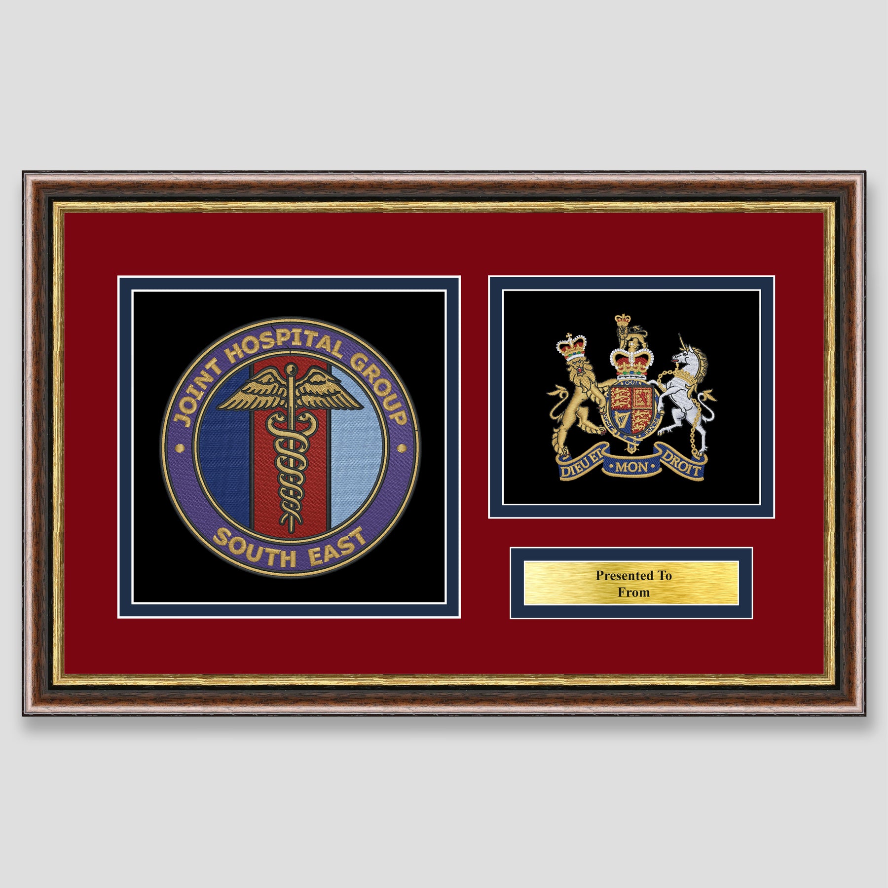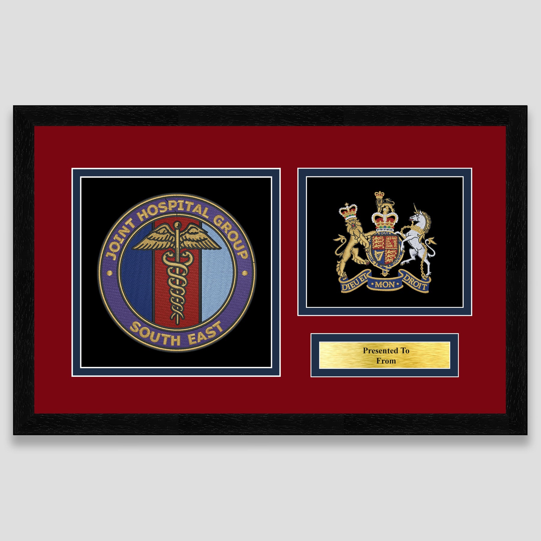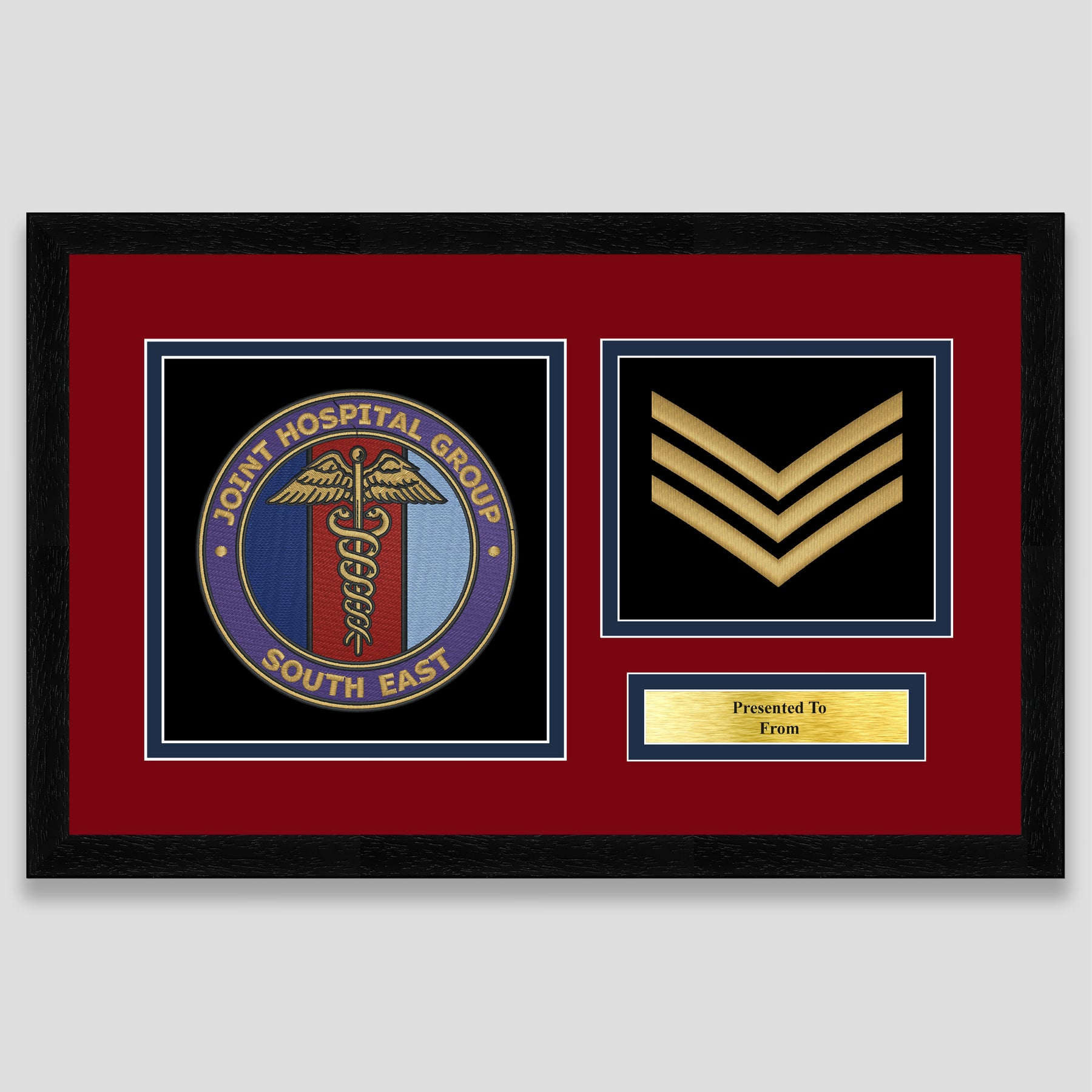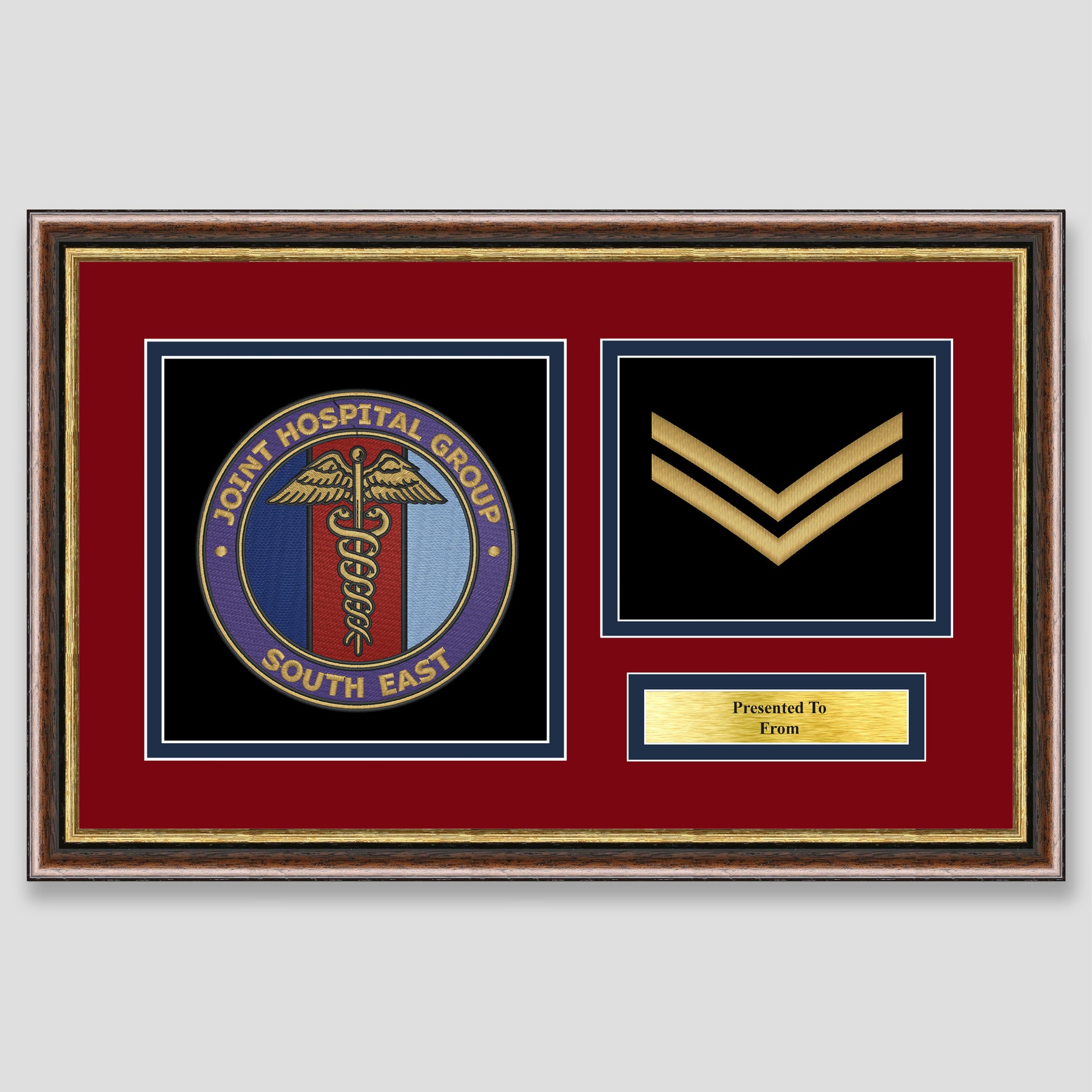 Military embroidery presentation of the Joint Hospital Group South East crest and features a rank. Ideal leaving gift to any service member or veteran and of course, is mounted, framed and finished with a personalised brass plaque.