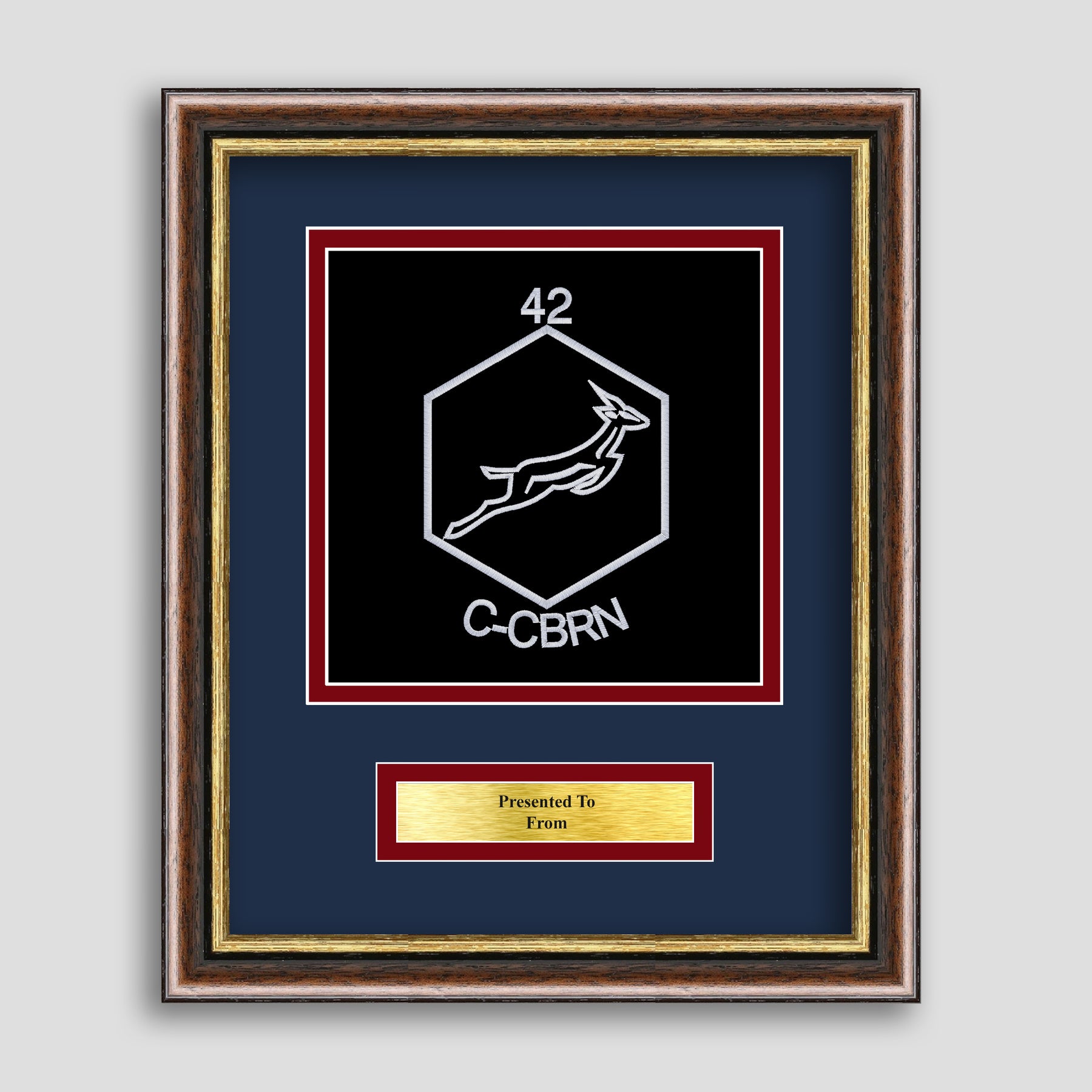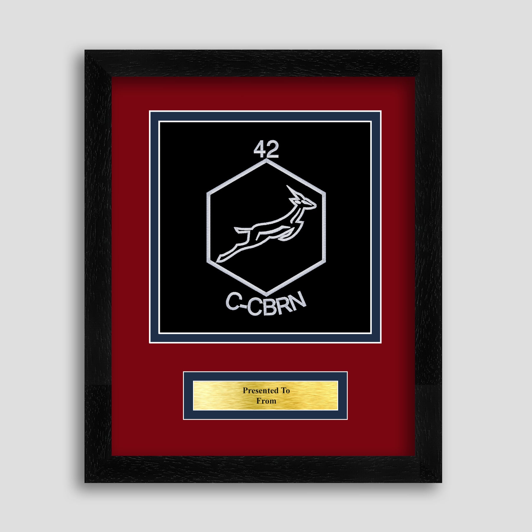 Military embroidery presentation of the 42 Fd Sqn C-CBRN. A stunning machine stitched design, mounted, framed and finished with a personalised brass plaque. Ideal leaving gift to any soldier or veteran.